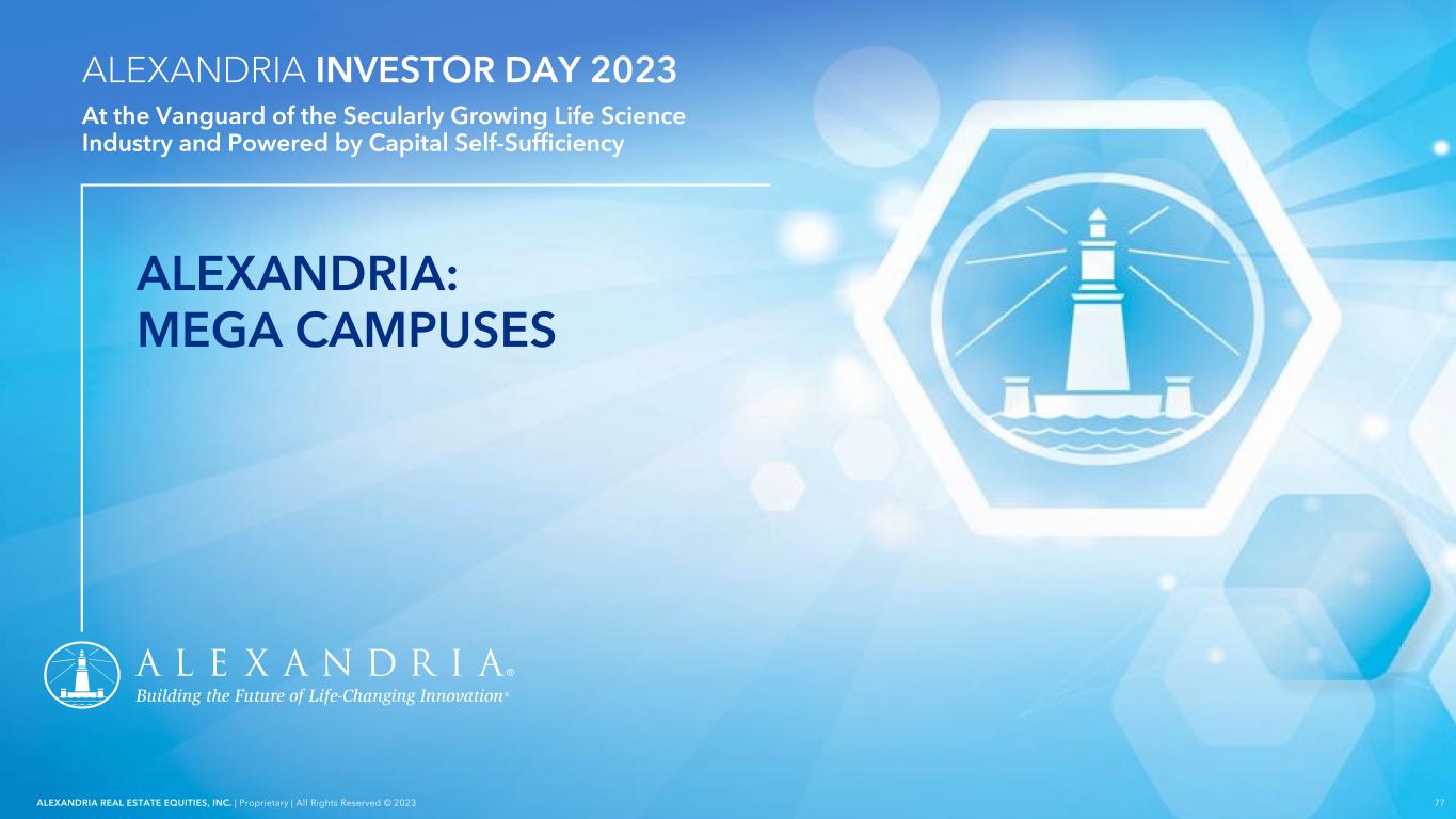 77ALEXANDRIA REAL ESTATE EQUITIES, INC. | Proprietary | All Rights Reserved © 2023 ALEXANDRIA INVESTOR DAY 2023 At the Vanguard of the Secularly Growing Life Science Industry and Powered by Capital Self-Sufficiency ALEXANDRIA: MEGA CAMPUSES