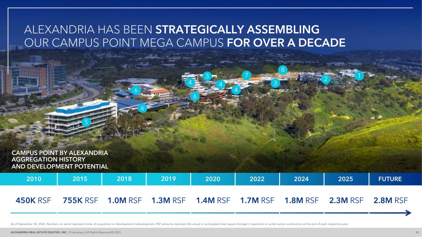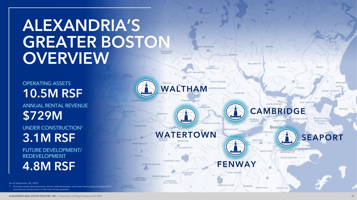 82ALEXANDRIA REAL ESTATE EQUITIES, INC. | Proprietary | All Rights Reserved © 2023 2020 2022 20242010 2015 2018 2019 2025 FUTURE ALEXANDRIA HAS BEEN STRATEGICALLY ASSEMBLING OUR CAMPUS POINT MEGA CAMPUS FOR OVER A DECADE 5 12 73 34 6 CAMPUS POINT BY ALEXANDRIA AGGREGATION HISTORY AND DEVELOPMENT POTENTIAL 4 4 6 6 450K RSF 755K RSF 1.0M RSF 1.3M RSF 1.4M RSF 1.7M RSF 2.3M RSF1.8M RSF 8 2.8M RSF As of September 30, 2023. Numbers on aerial represent order of acquisition or development/redevelopment. RSF amounts represent the actual or anticipated total square footage in operation or under active construction at the end of each respective year.