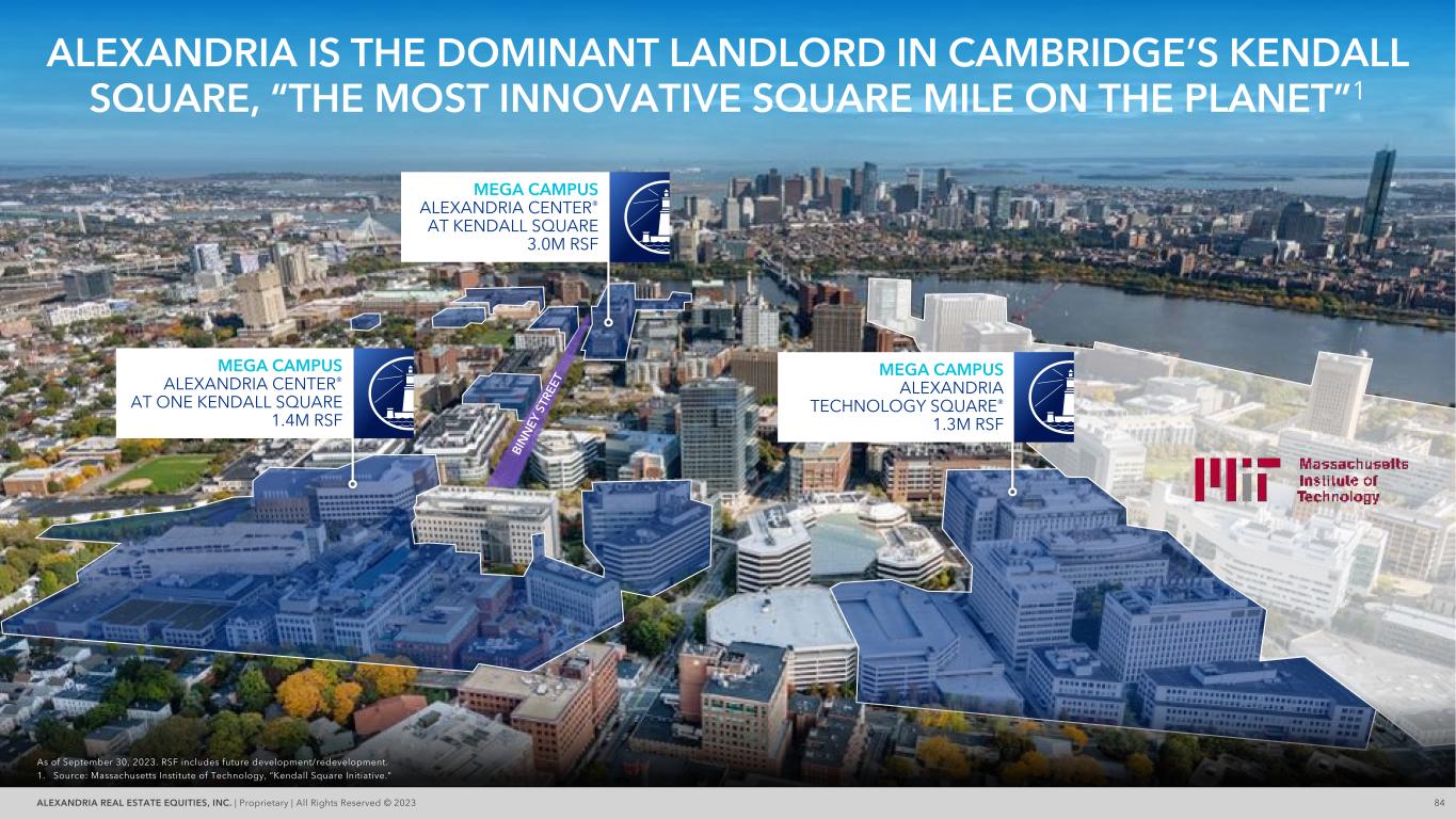 83ALEXANDRIA REAL ESTATE EQUITIES, INC. | Proprietary | All Rights Reserved © 2023 FENWAY SEAPORT WATERTOWN WALTHAM ALEXANDRIA’S GREATER BOSTON OVERVIEW OPERATING ASSETS 10.5M RSF ANNUAL RENTAL REVENUE $729M UNDER CONSTRUCTION1 3.1M RSF FUTURE DEVELOPMENT/ REDEVELOPMENT 4.8M RSF As of September 30, 2023. 1. Includes active development, active redevelopment, and near-term projects expected to commence construction in the next three quarters. CAMBRIDGE