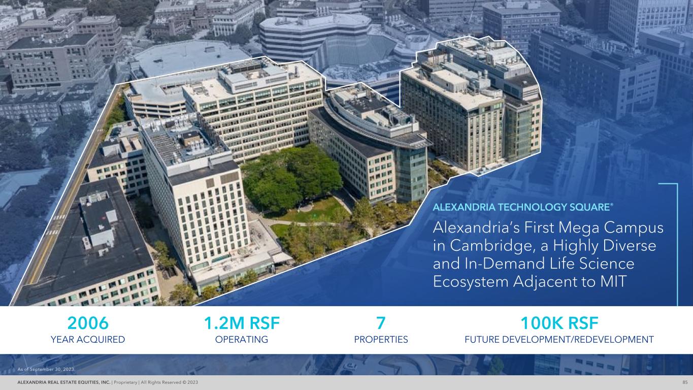 84ALEXANDRIA REAL ESTATE EQUITIES, INC. | Proprietary | All Rights Reserved © 2023 BI N N EY S TR EE T ALEXANDRIA IS THE DOMINANT LANDLORD IN CAMBRIDGE’S KENDALL SQUARE, “THE MOST INNOVATIVE SQUARE MILE ON THE PLANET”1 MEGA CAMPUS ALEXANDRIA CENTER® AT KENDALL SQUARE 3.0M RSF MEGA CAMPUS ALEXANDRIA CENTER® AT ONE KENDALL SQUARE 1.4M RSF As of September 30, 2023. RSF includes future development/redevelopment. 1. Source: Massachusetts Institute of Technology, “Kendall Square Initiative.” MEGA CAMPUS ALEXANDRIA TECHNOLOGY SQUARE® 1.3M RSF