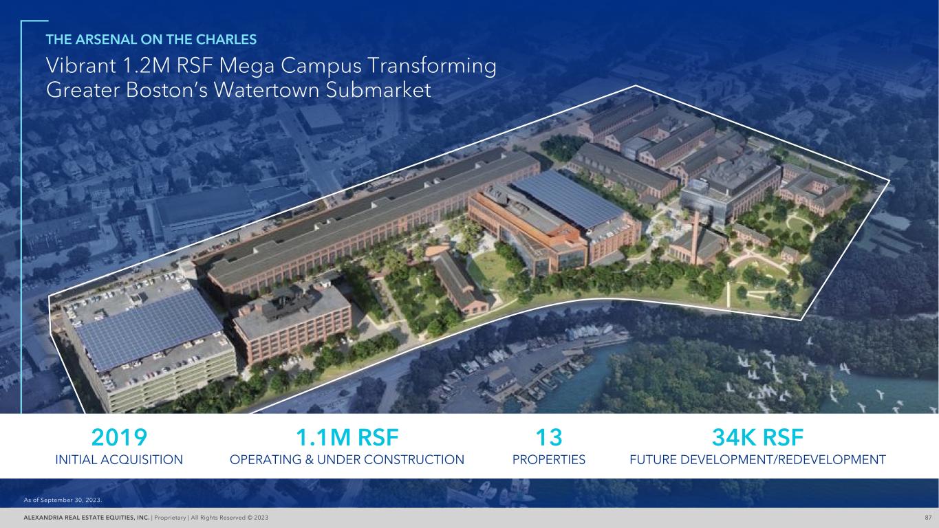 86ALEXANDRIA REAL ESTATE EQUITIES, INC. | Proprietary | All Rights Reserved © 2023 ALEXANDRIA IS THE DOMINANT LANDLORD IN WATERTOWN, A DYNAMIC SUBMARKET CATALYZED BY OUR CONVICTION AND FUELED BY OUR SUCCESS IN CAMBRIDGE WATERTOWN FENWAY As of September 30, 2023. RSF includes future development/redevelopment. MEGA CAMPUS THE ARSENAL ON THE CHARLES 1.2M RSF CAMBRIDGE MEGA CAMPUS 480 ARSENAL WAY AND 446, 458, 500, AND 550 ARSENAL STREET 1.0M RSF 99 COOLIDGE AVENUE 321K RSF