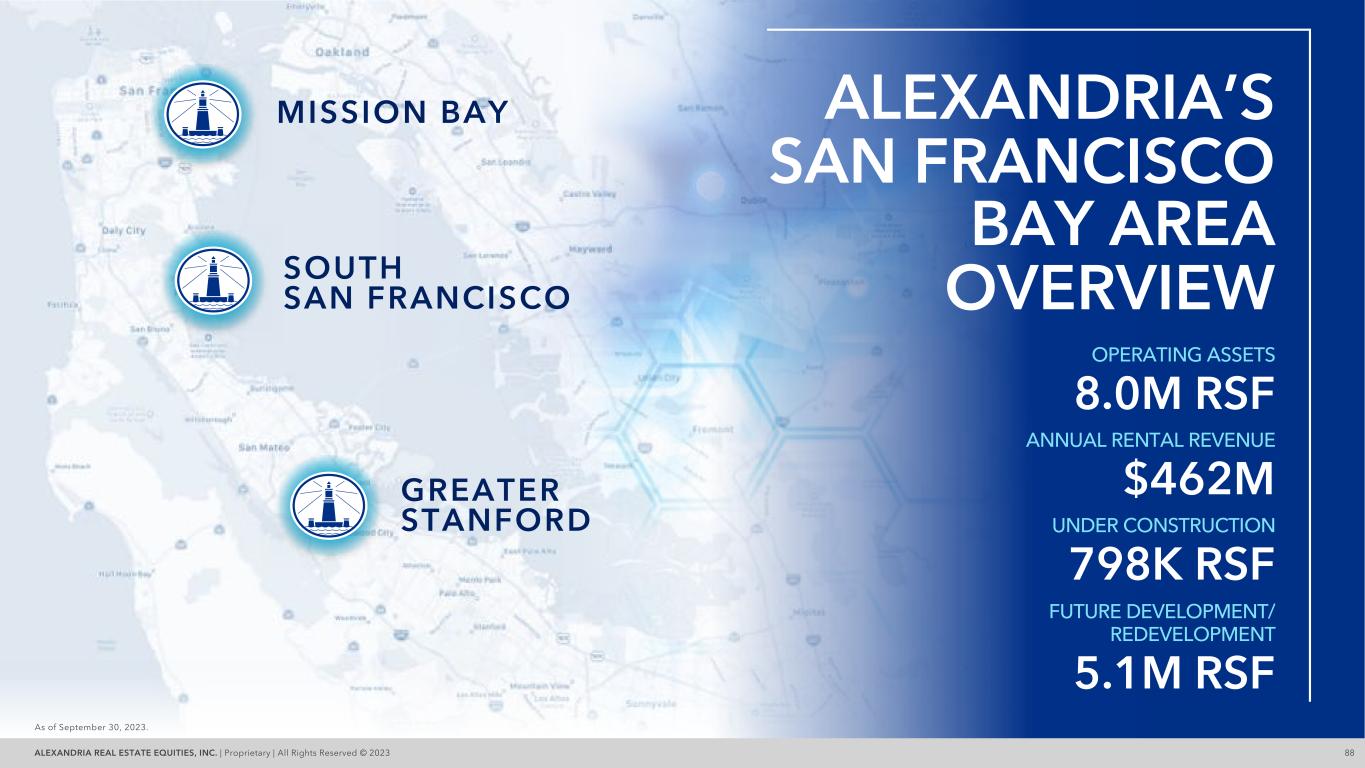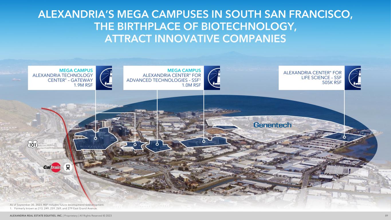 88ALEXANDRIA REAL ESTATE EQUITIES, INC. | Proprietary | All Rights Reserved © 2023 ALEXANDRIA’S SAN FRANCISCO BAY AREA OVERVIEW OPERATING ASSETS 8.0M RSF ANNUAL RENTAL REVENUE $462M UNDER CONSTRUCTION 798K RSF FUTURE DEVELOPMENT/ REDEVELOPMENT 5.1M RSF As of September 30, 2023. MISSION BAY SOUTH SAN FRANCISCO GREATER STANFORD