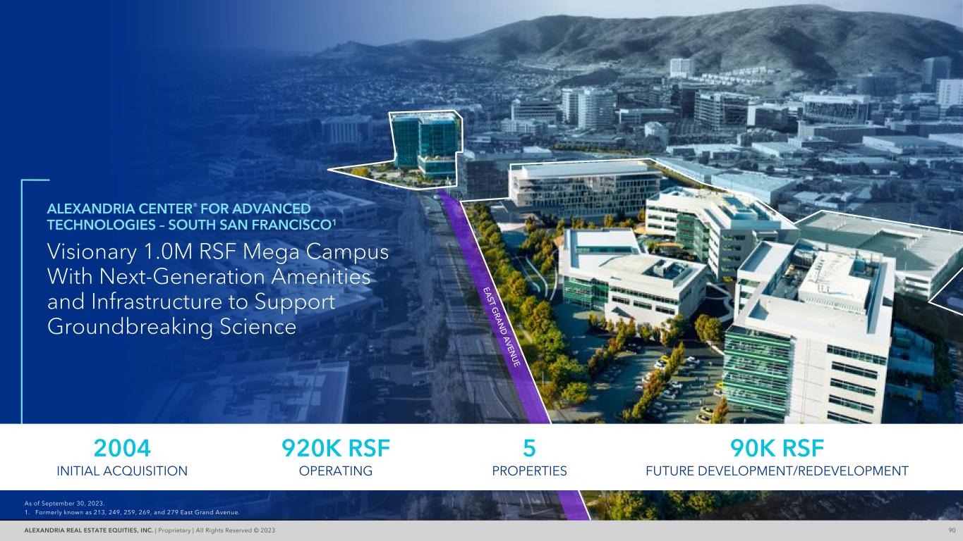 89ALEXANDRIA REAL ESTATE EQUITIES, INC. | Proprietary | All Rights Reserved © 2023 ALEXANDRIA’S MEGA CAMPUSES IN SOUTH SAN FRANCISCO, THE BIRTHPLACE OF BIOTECHNOLOGY, ATTRACT INNOVATIVE COMPANIES MEGA CAMPUS ALEXANDRIA CENTER® FOR ADVANCED TECHNOLOGIES – SSF1 1.0M RSF ALEXANDRIA CENTER® FOR LIFE SCIENCE – SSF 505K RSF As of September 30, 2023. RSF includes future development/redevelopment. 1. Formerly known as 213, 249, 259, 269, and 279 East Grand Avenue. MEGA CAMPUS ALEXANDRIA TECHNOLOGY CENTER® – GATEWAY 1.9M RSF