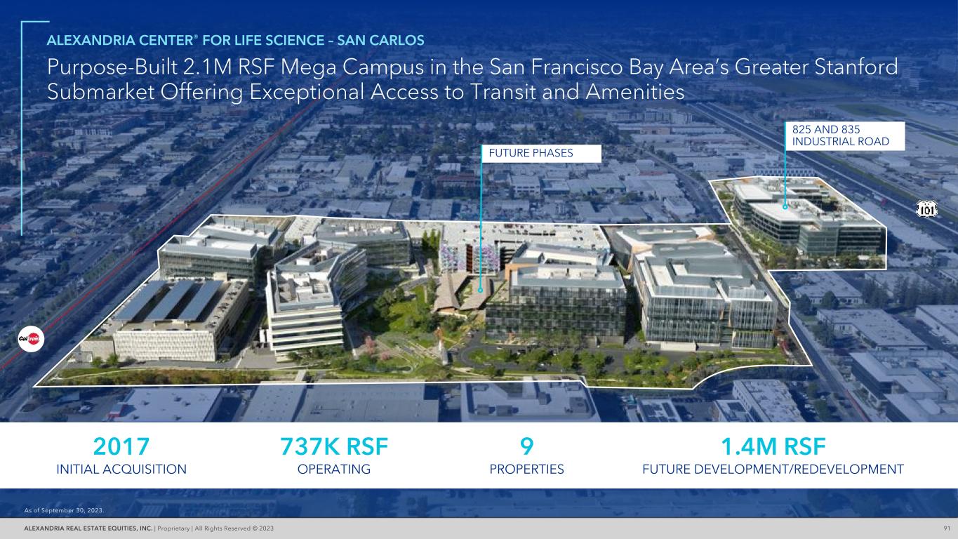 90ALEXANDRIA REAL ESTATE EQUITIES, INC. | Proprietary | All Rights Reserved © 2023 ALEXANDRIA CENTER® FOR ADVANCED TECHNOLOGIES – SOUTH SAN FRANCISCO1 Visionary 1.0M RSF Mega Campus With Next-Generation Amenities and Infrastructure to Support Groundbreaking Science As of September 30, 2023. 1. Formerly known as 213, 249, 259, 269, and 279 East Grand Avenue. 920K RSF OPERATING 5 PROPERTIES 90K RSF FUTURE DEVELOPMENT/REDEVELOPMENT 2004 INITIAL ACQUISITION EA ST G RA N D A VEN U E