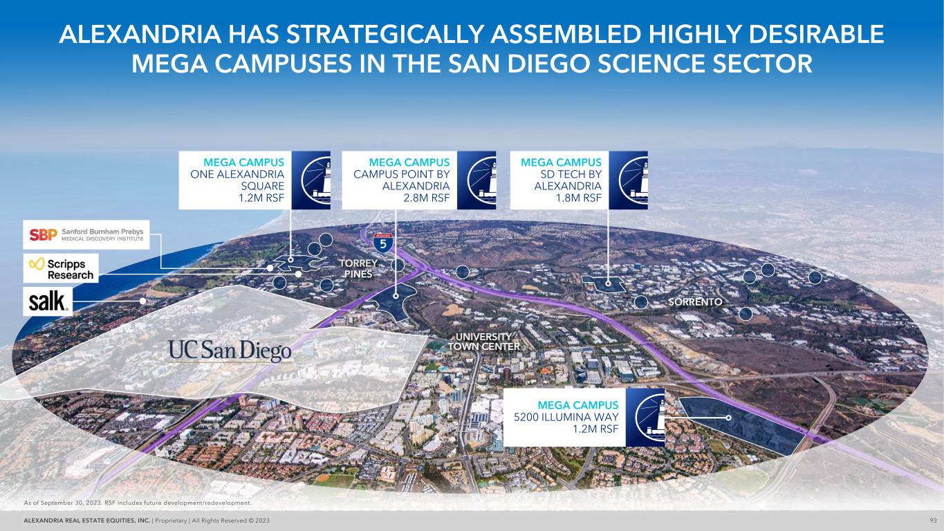 92ALEXANDRIA REAL ESTATE EQUITIES, INC. | Proprietary | All Rights Reserved © 2023 UNIVERSITY TOWN CENTER SORRENTO TORREY PINES ALEXANDRIA’S SAN DIEGO OVERVIEW OPERATING ASSETS 7.9M RSF ANNUAL RENTAL REVENUE $313M UNDER CONSTRUCTION1 1.2M RSF FUTURE DEVELOPMENT/ REDEVELOPMENT 5.5M RSF As of September 30, 2023. 1. Includes active development, active redevelopment, and near-term projects expected to commence construction in the next three quarters.