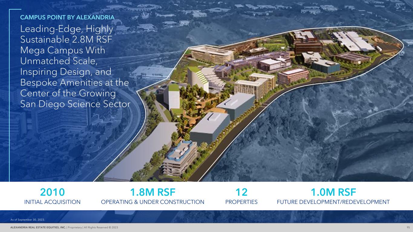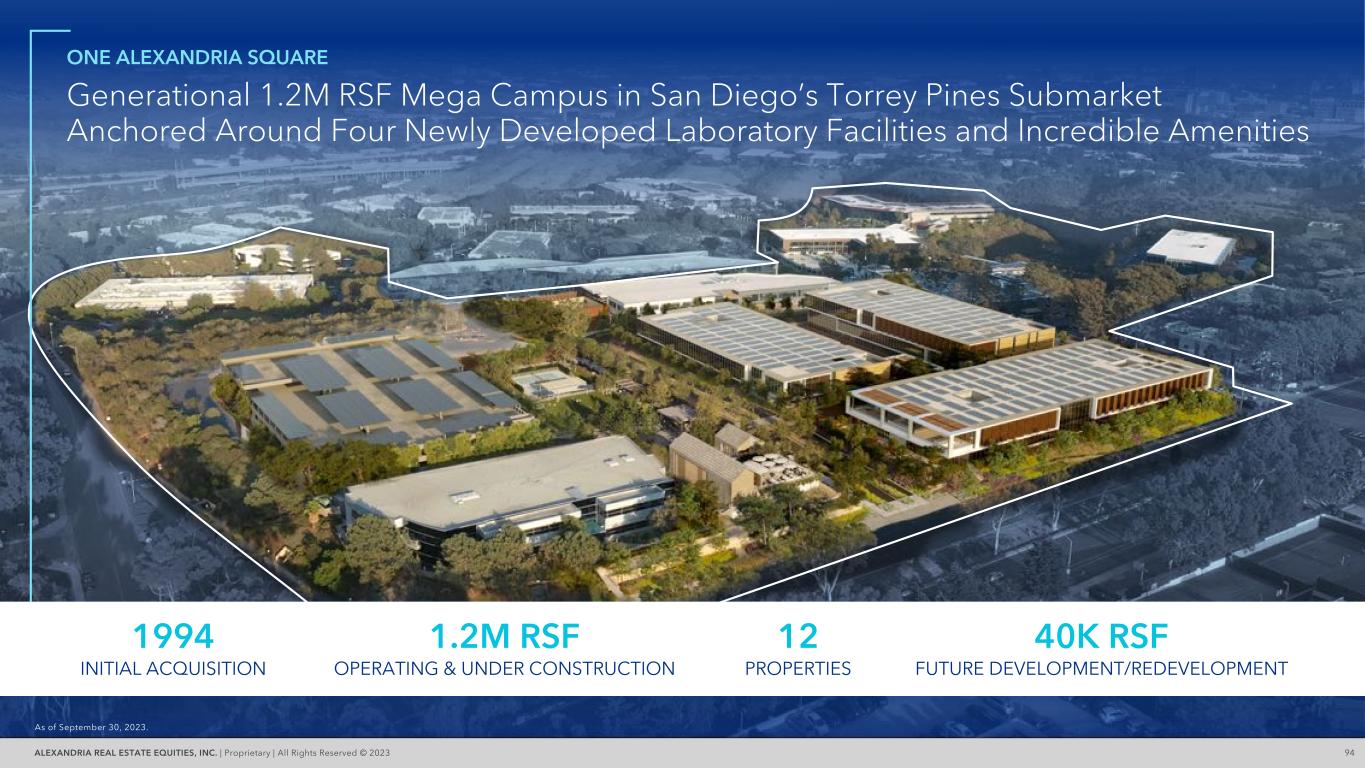 93ALEXANDRIA REAL ESTATE EQUITIES, INC. | Proprietary | All Rights Reserved © 2023 ALEXANDRIA HAS STRATEGICALLY ASSEMBLED HIGHLY DESIRABLE MEGA CAMPUSES IN THE SAN DIEGO SCIENCE SECTOR MEGA CAMPUS CAMPUS POINT BY ALEXANDRIA 2.8M RSF As of September 30, 2023. RSF includes future development/redevelopment. MEGA CAMPUS SD TECH BY ALEXANDRIA 1.8M RSF MEGA CAMPUS ONE ALEXANDRIA SQUARE 1.2M RSF MEGA CAMPUS 5200 ILLUMINA WAY 1.2M RSF
