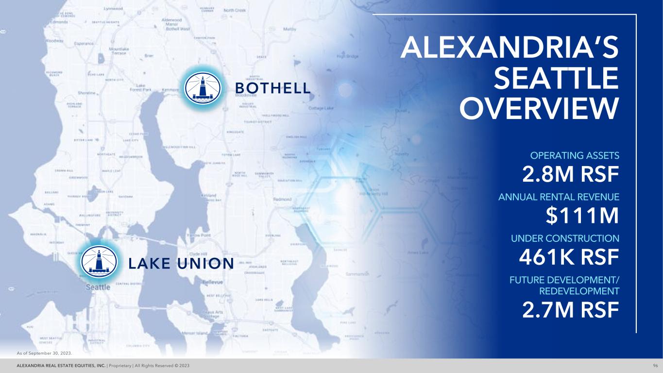 96ALEXANDRIA REAL ESTATE EQUITIES, INC. | Proprietary | All Rights Reserved © 2023 ALEXANDRIA’S SEATTLE OVERVIEW OPERATING ASSETS 2.8M RSF ANNUAL RENTAL REVENUE $111M UNDER CONSTRUCTION 461K RSF FUTURE DEVELOPMENT/ REDEVELOPMENT 2.7M RSF BOTHELL LAKE UNION As of September 30, 2023.