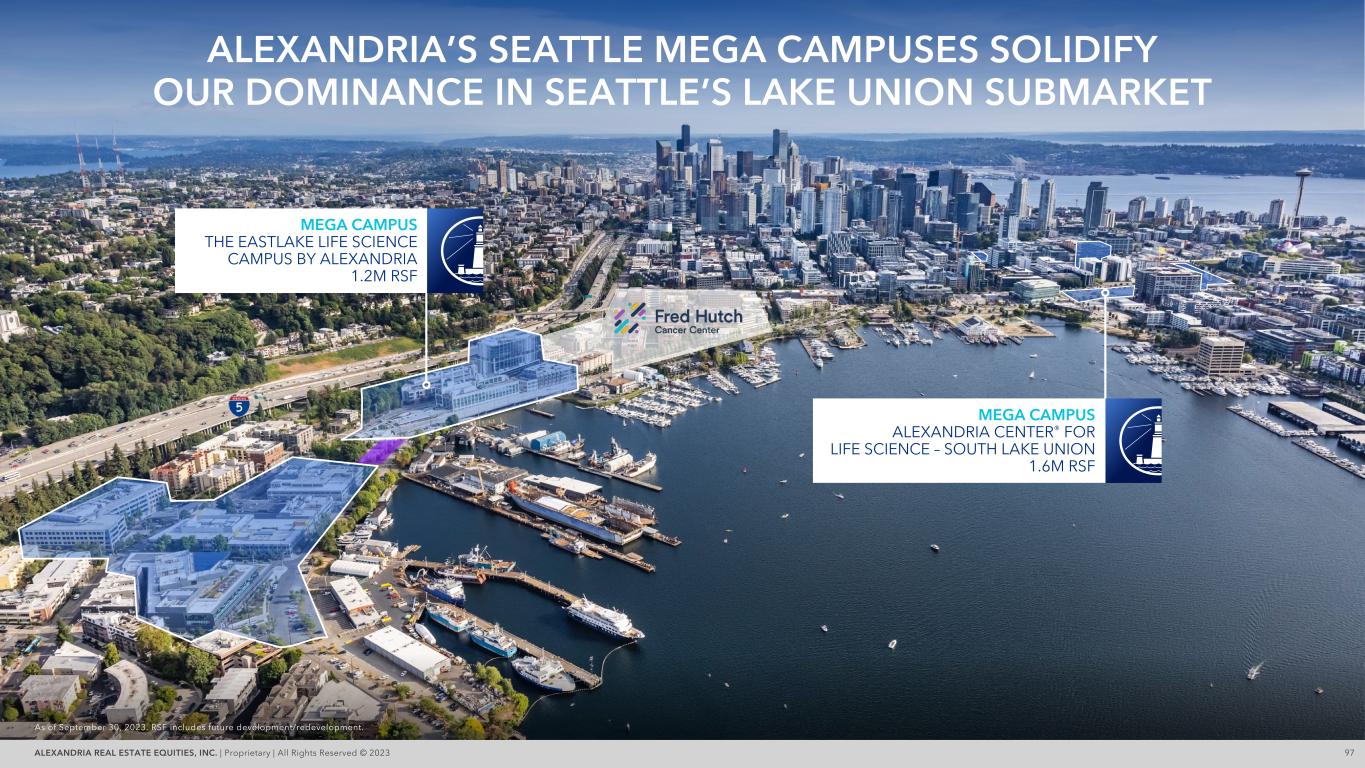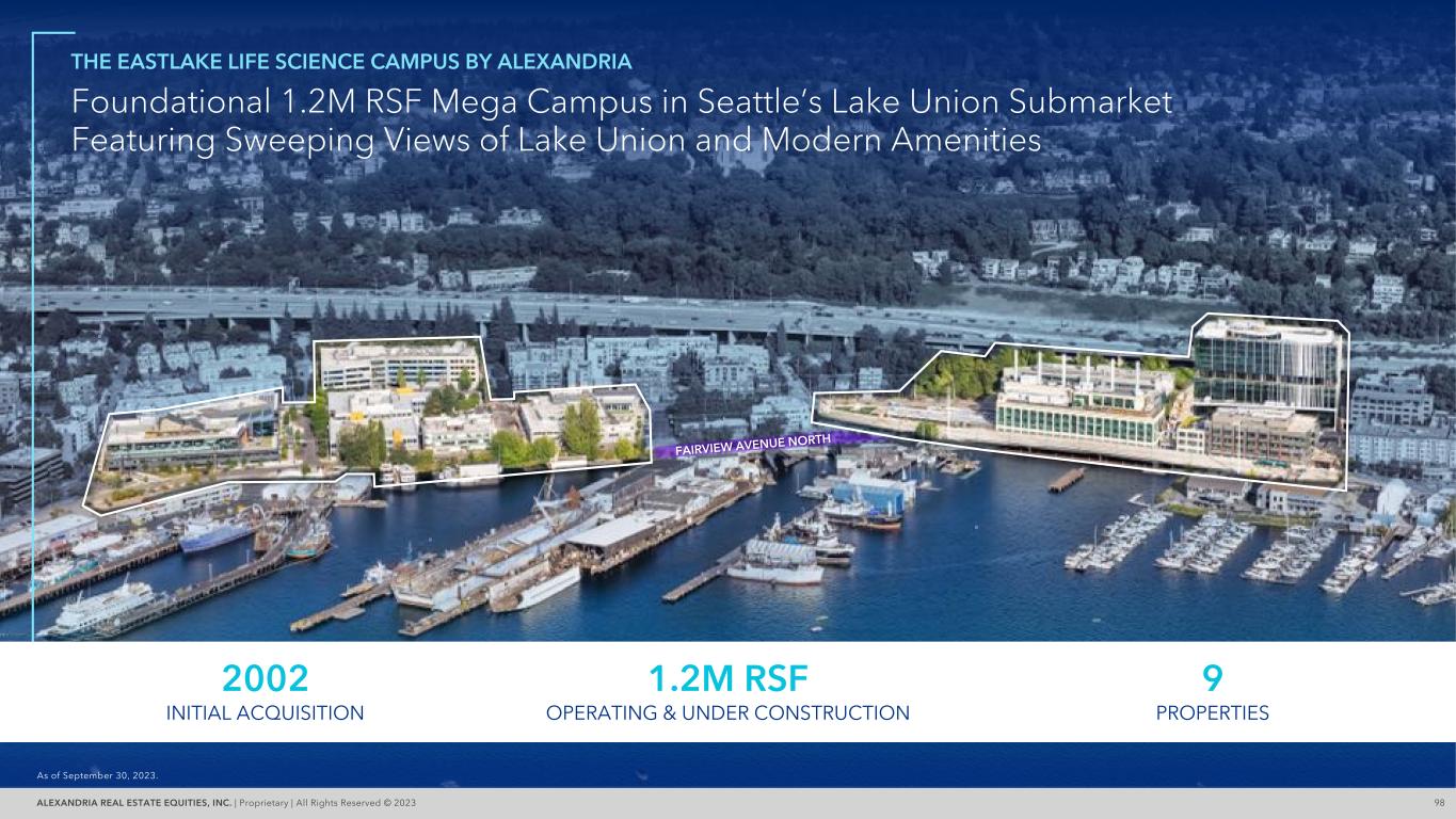 97ALEXANDRIA REAL ESTATE EQUITIES, INC. | Proprietary | All Rights Reserved © 2023 ALEXANDRIA’S SEATTLE MEGA CAMPUSES SOLIDIFY OUR DOMINANCE IN SEATTLE’S LAKE UNION SUBMARKET As of September 30, 2023. RSF includes future development/redevelopment. MEGA CAMPUS THE EASTLAKE LIFE SCIENCE CAMPUS BY ALEXANDRIA 1.2M RSF MEGA CAMPUS ALEXANDRIA CENTER® FOR LIFE SCIENCE – SOUTH LAKE UNION 1.6M RSF