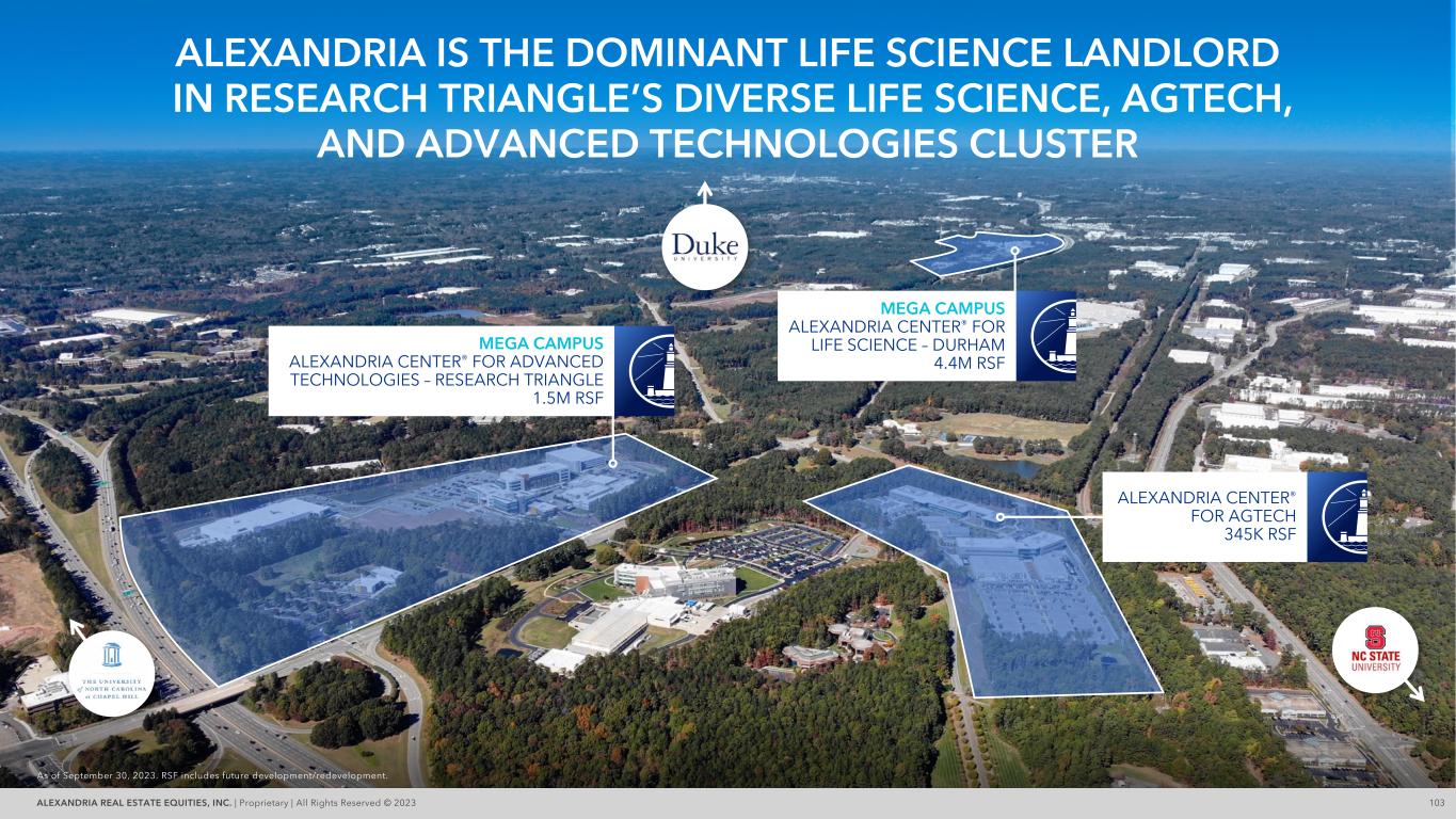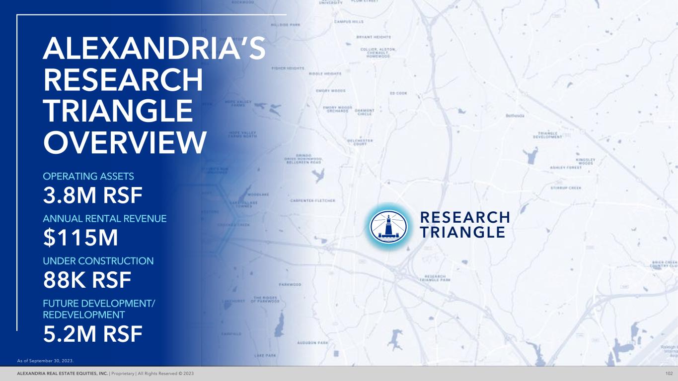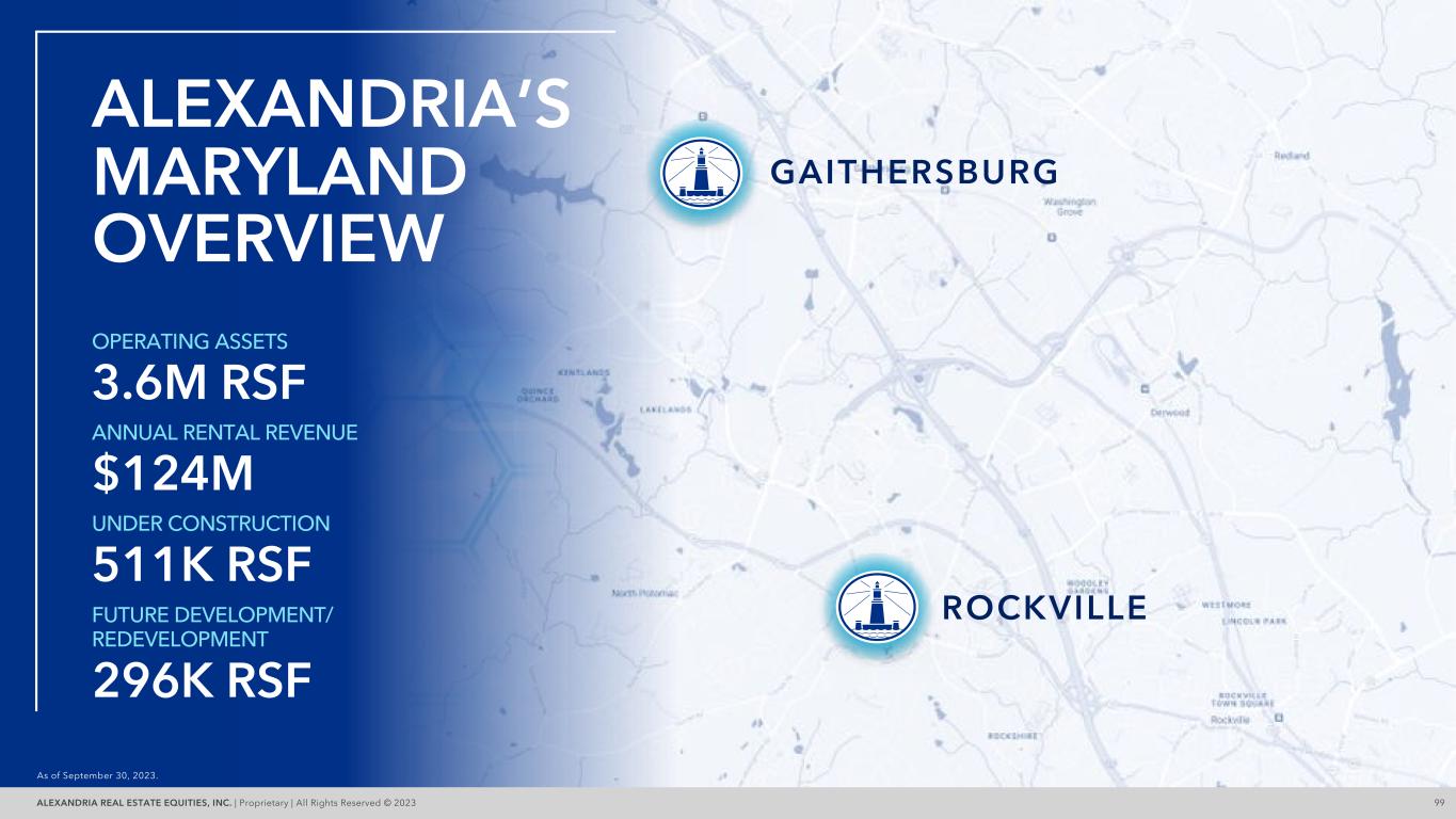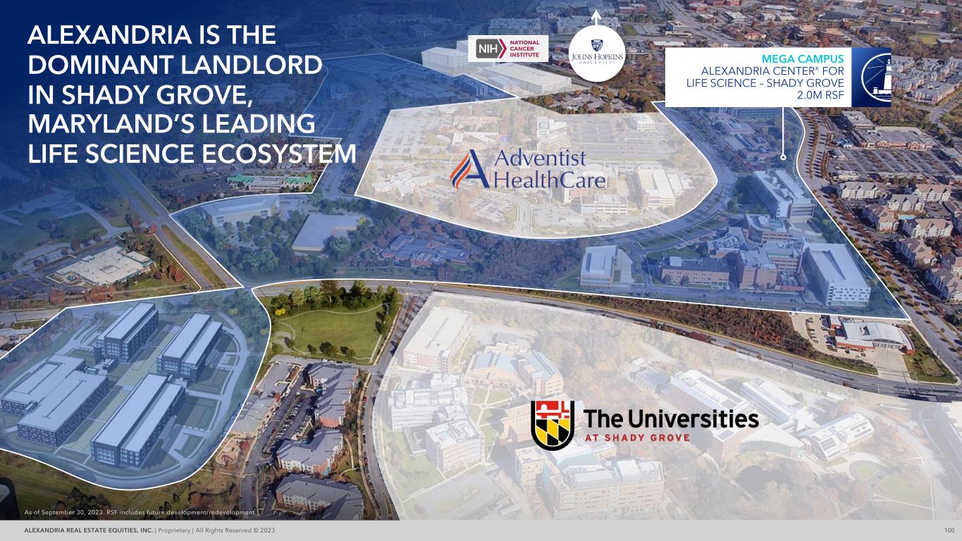 99ALEXANDRIA REAL ESTATE EQUITIES, INC. | Proprietary | All Rights Reserved © 2023 ROCKVILLE GAITHERSBURG ALEXANDRIA’S MARYLAND OVERVIEW OPERATING ASSETS 3.6M RSF ANNUAL RENTAL REVENUE $124M UNDER CONSTRUCTION 511K RSF FUTURE DEVELOPMENT/ REDEVELOPMENT 296K RSF As of September 30, 2023.