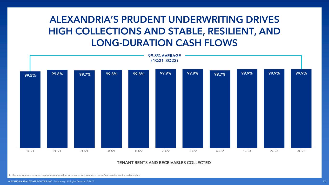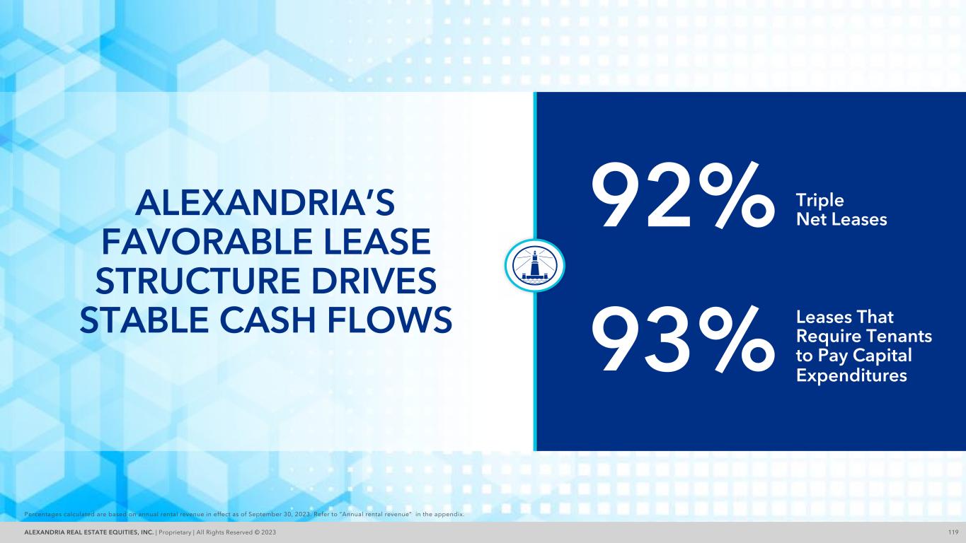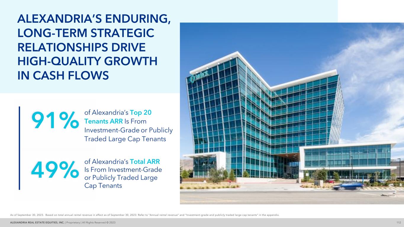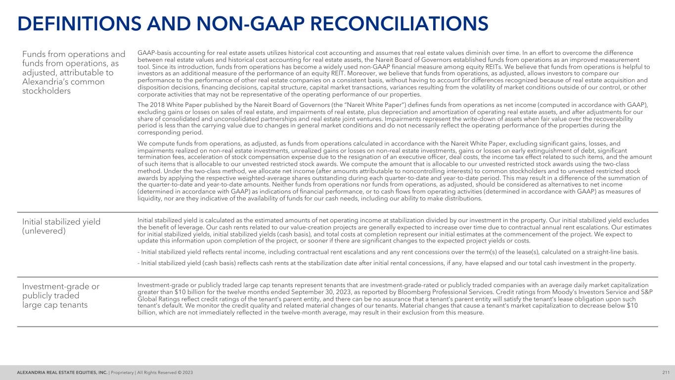 211ALEXANDRIA REAL ESTATE EQUITIES, INC. | Proprietary | All Rights Reserved © 2023 DEFINITIONS AND NON-GAAP RECONCILIATIONS Funds from operations and funds from operations, as adjusted, attributable to Alexandria’s common stockholders GAAP-basis accounting for real estate assets utilizes historical cost accounting and assumes that real estate values diminish over time. In an effort to overcome the difference between real estate values and historical cost accounting for real estate assets, the Nareit Board of Governors established funds from operations as an improved measurement tool. Since its introduction, funds from operations has become a widely used non-GAAP financial measure among equity REITs. We believe that funds from operations is helpful to investors as an additional measure of the performance of an equity REIT. Moreover, we believe that funds from operations, as adjusted, allows investors to compare our performance to the performance of other real estate companies on a consistent basis, without having to account for differences recognized because of real estate acquisition and disposition decisions, financing decisions, capital structure, capital market transactions, variances resulting from the volatility of market conditions outside of our control, or other corporate activities that may not be representative of the operating performance of our properties. The 2018 White Paper published by the Nareit Board of Governors (the “Nareit White Paper”) defines funds from operations as net income (computed in accordance with GAAP), excluding gains or losses on sales of real estate, and impairments of real estate, plus depreciation and amortization of operating real estate assets, and after adjustments for our share of consolidated and unconsolidated partnerships and real estate joint ventures. Impairments represent the write-down of assets when fair value over the recoverability period is less than the carrying value due to changes in general market conditions and do not necessarily reflect the operating performance of the properties during the corresponding period. We compute funds from operations, as adjusted, as funds from operations calculated in accordance with the Nareit White Paper, excluding significant gains, losses, and impairments realized on non-real estate investments, unrealized gains or losses on non-real estate investments, gains or losses on early extinguishment of debt, significant termination fees, acceleration of stock compensation expense due to the resignation of an executive officer, deal costs, the income tax effect related to such items, and the amount of such items that is allocable to our unvested restricted stock awards. We compute the amount that is allocable to our unvested restricted stock awards using the two-class method. Under the two-class method, we allocate net income (after amounts attributable to noncontrolling interests) to common stockholders and to unvested restricted stock awards by applying the respective weighted-average shares outstanding during each quarter-to-date and year-to-date period. This may result in a difference of the summation of the quarter-to-date and year-to-date amounts. Neither funds from operations nor funds from operations, as adjusted, should be considered as alternatives to net income (determined in accordance with GAAP) as indications of financial performance, or to cash flows from operating activities (determined in accordance with GAAP) as measures of liquidity, nor are they indicative of the availability of funds for our cash needs, including our ability to make distributions. Initial stabilized yield (unlevered) Initial stabilized yield is calculated as the estimated amounts of net operating income at stabilization divided by our investment in the property. Our initial stabilized yield excludes the benefit of leverage. Our cash rents related to our value-creation projects are generally expected to increase over time due to contractual annual rent escalations. Our estimates for initial stabilized yields, initial stabilized yields (cash basis), and total costs at completion represent our initial estimates at the commencement of the project. We expect to update this information upon completion of the project, or sooner if there are significant changes to the expected project yields or costs. - Initial stabilized yield reflects rental income, including contractual rent escalations and any rent concessions over the term(s) of the lease(s), calculated on a straight-line basis. - Initial stabilized yield (cash basis) reflects cash rents at the stabilization date after initial rental concessions, if any, have elapsed and our total cash investment in the property. Investment-grade or publicly traded large cap tenants Investment-grade or publicly traded large cap tenants represent tenants that are investment-grade-rated or publicly traded companies with an average daily market capitalization greater than $10 billion for the twelve months ended September 30, 2023, as reported by Bloomberg Professional Services. Credit ratings from Moody’s Investors Service and S&P Global Ratings reflect credit ratings of the tenant’s parent entity, and there can be no assurance that a tenant’s parent entity will satisfy the tenant’s lease obligation upon such tenant’s default. We monitor the credit quality and related material changes of our tenants. Material changes that cause a tenant’s market capitalization to decrease below $10 billion, which are not immediately reflected in the twelve-month average, may result in their exclusion from this measure.