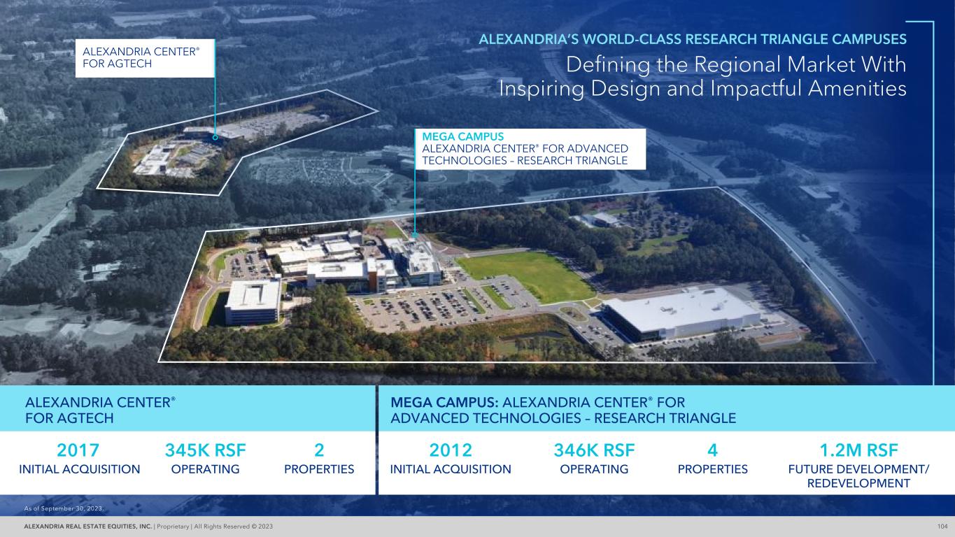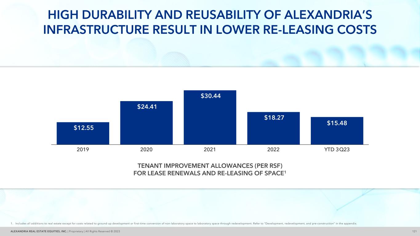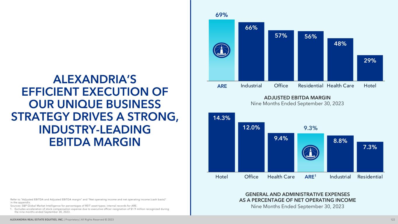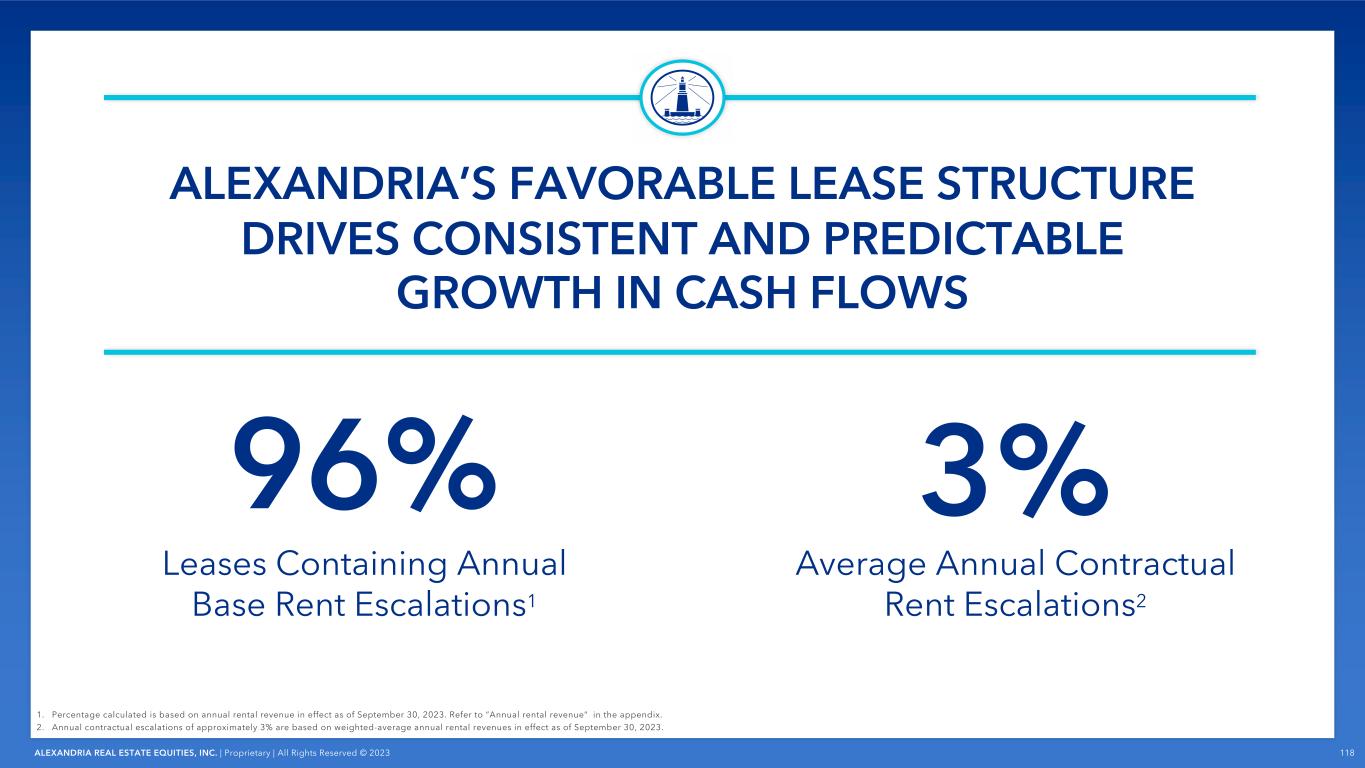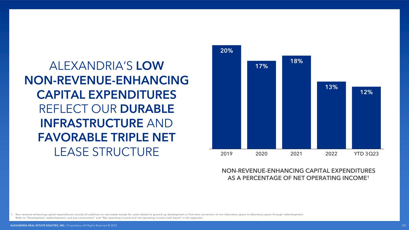 211ALEXANDRIA REAL ESTATE EQUITIES, INC. | Proprietary | All Rights Reserved © 2023 DEFINITIONS AND NON-GAAP RECONCILIATIONS Funds from operations and funds from operations, as adjusted, attributable to Alexandria’s common stockholders GAAP-basis accounting for real estate assets utilizes historical cost accounting and assumes that real estate values diminish over time. In an effort to overcome the difference between real estate values and historical cost accounting for real estate assets, the Nareit Board of Governors established funds from operations as an improved measurement tool. Since its introduction, funds from operations has become a widely used non-GAAP financial measure among equity REITs. We believe that funds from operations is helpful to investors as an additional measure of the performance of an equity REIT. Moreover, we believe that funds from operations, as adjusted, allows investors to compare our performance to the performance of other real estate companies on a consistent basis, without having to account for differences recognized because of real estate acquisition and disposition decisions, financing decisions, capital structure, capital market transactions, variances resulting from the volatility of market conditions outside of our control, or other corporate activities that may not be representative of the operating performance of our properties. The 2018 White Paper published by the Nareit Board of Governors (the “Nareit White Paper”) defines funds from operations as net income (computed in accordance with GAAP), excluding gains or losses on sales of real estate, and impairments of real estate, plus depreciation and amortization of operating real estate assets, and after adjustments for our share of consolidated and unconsolidated partnerships and real estate joint ventures. Impairments represent the write-down of assets when fair value over the recoverability period is less than the carrying value due to changes in general market conditions and do not necessarily reflect the operating performance of the properties during the corresponding period. We compute funds from operations, as adjusted, as funds from operations calculated in accordance with the Nareit White Paper, excluding significant gains, losses, and impairments realized on non-real estate investments, unrealized gains or losses on non-real estate investments, gains or losses on early extinguishment of debt, significant termination fees, acceleration of stock compensation expense due to the resignation of an executive officer, deal costs, the income tax effect related to such items, and the amount of such items that is allocable to our unvested restricted stock awards. We compute the amount that is allocable to our unvested restricted stock awards using the two-class method. Under the two-class method, we allocate net income (after amounts attributable to noncontrolling interests) to common stockholders and to unvested restricted stock awards by applying the respective weighted-average shares outstanding during each quarter-to-date and year-to-date period. This may result in a difference of the summation of the quarter-to-date and year-to-date amounts. Neither funds from operations nor funds from operations, as adjusted, should be considered as alternatives to net income (determined in accordance with GAAP) as indications of financial performance, or to cash flows from operating activities (determined in accordance with GAAP) as measures of liquidity, nor are they indicative of the availability of funds for our cash needs, including our ability to make distributions. Initial stabilized yield (unlevered) Initial stabilized yield is calculated as the estimated amounts of net operating income at stabilization divided by our investment in the property. Our initial stabilized yield excludes the benefit of leverage. Our cash rents related to our value-creation projects are generally expected to increase over time due to contractual annual rent escalations. Our estimates for initial stabilized yields, initial stabilized yields (cash basis), and total costs at completion represent our initial estimates at the commencement of the project. We expect to update this information upon completion of the project, or sooner if there are significant changes to the expected project yields or costs. - Initial stabilized yield reflects rental income, including contractual rent escalations and any rent concessions over the term(s) of the lease(s), calculated on a straight-line basis. - Initial stabilized yield (cash basis) reflects cash rents at the stabilization date after initial rental concessions, if any, have elapsed and our total cash investment in the property. Investment-grade or publicly traded large cap tenants Investment-grade or publicly traded large cap tenants represent tenants that are investment-grade-rated or publicly traded companies with an average daily market capitalization greater than $10 billion for the twelve months ended September 30, 2023, as reported by Bloomberg Professional Services. Credit ratings from Moody’s Investors Service and S&P Global Ratings reflect credit ratings of the tenant’s parent entity, and there can be no assurance that a tenant’s parent entity will satisfy the tenant’s lease obligation upon such tenant’s default. We monitor the credit quality and related material changes of our tenants. Material changes that cause a tenant’s market capitalization to decrease below $10 billion, which are not immediately reflected in the twelve-month average, may result in their exclusion from this measure.