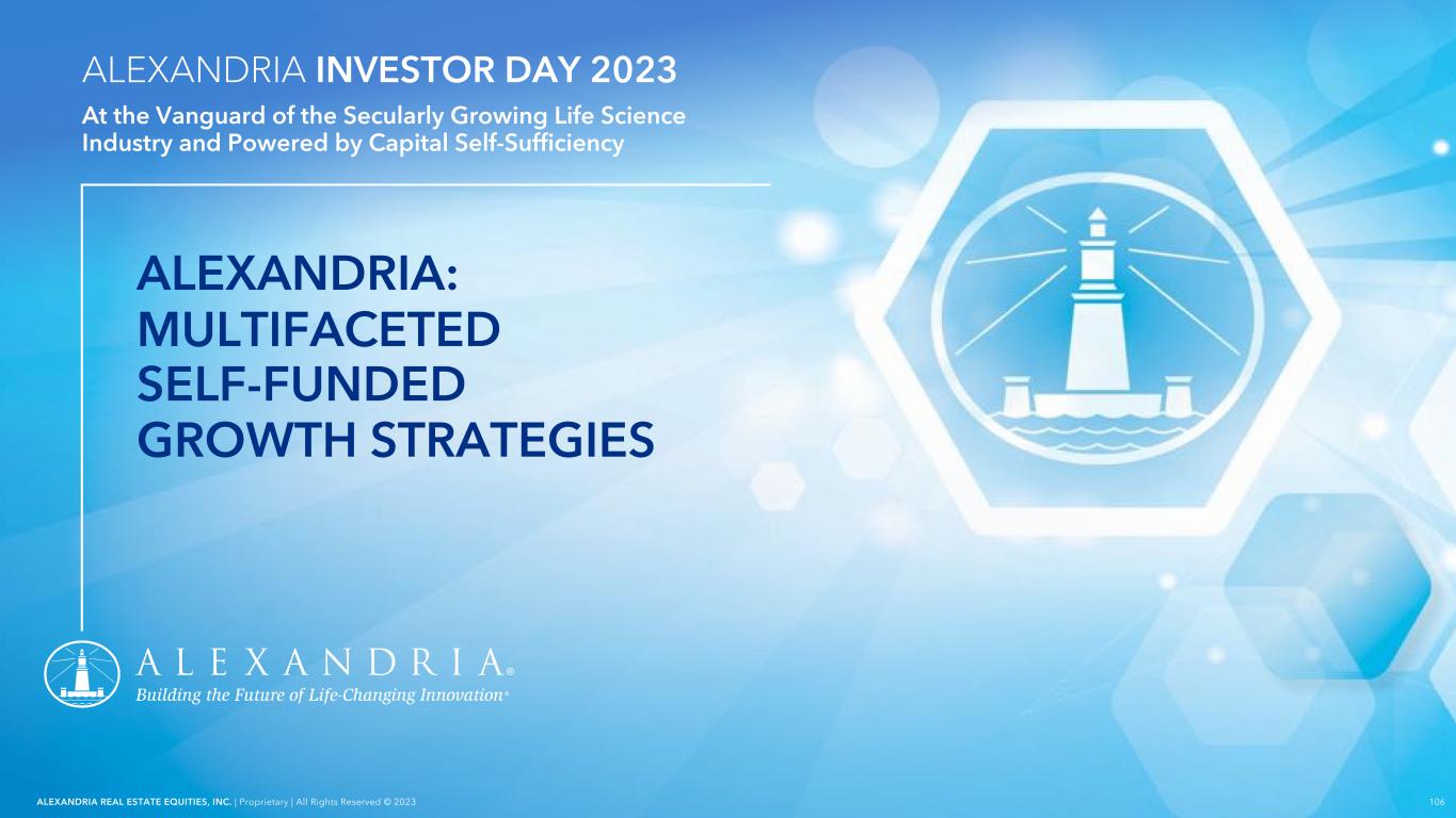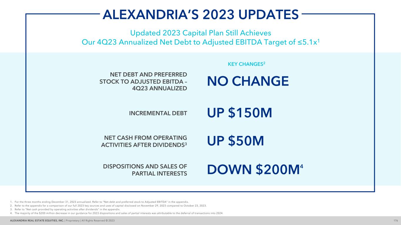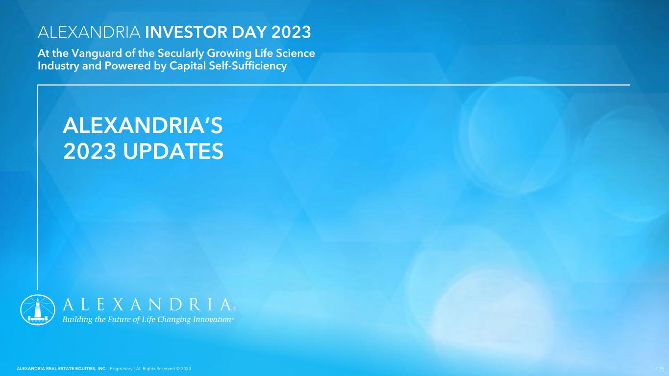 175ALEXANDRIA REAL ESTATE EQUITIES, INC. | Proprietary | All Rights Reserved © 2023 ALEXANDRIA INVESTOR DAY 2023 At the Vanguard of the Secularly Growing Life Science Industry and Powered by Capital Self-Sufficiency ALEXANDRIA’S 2023 UPDATES