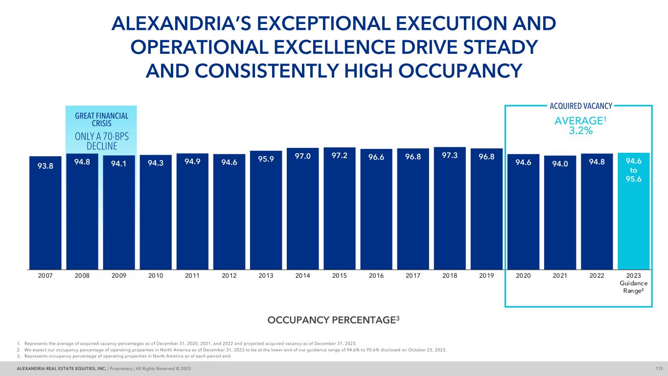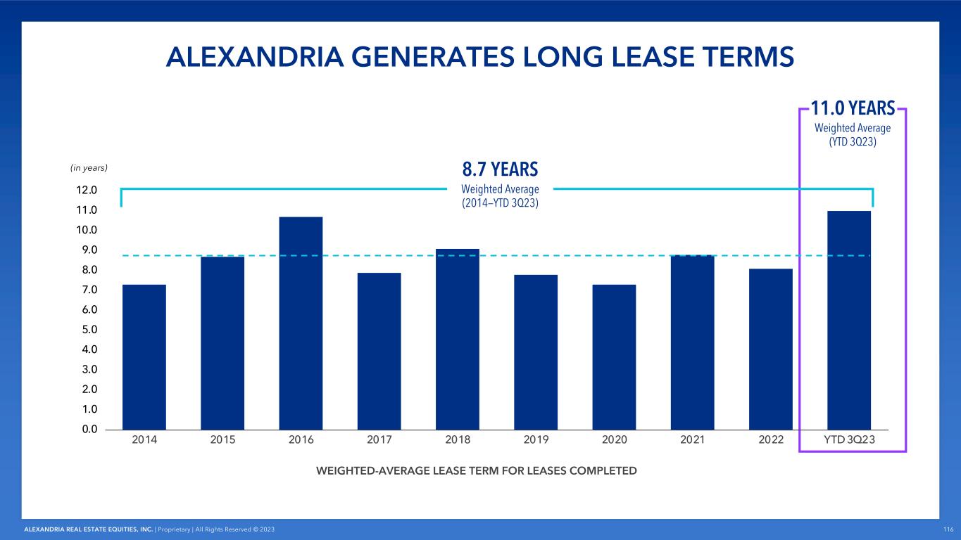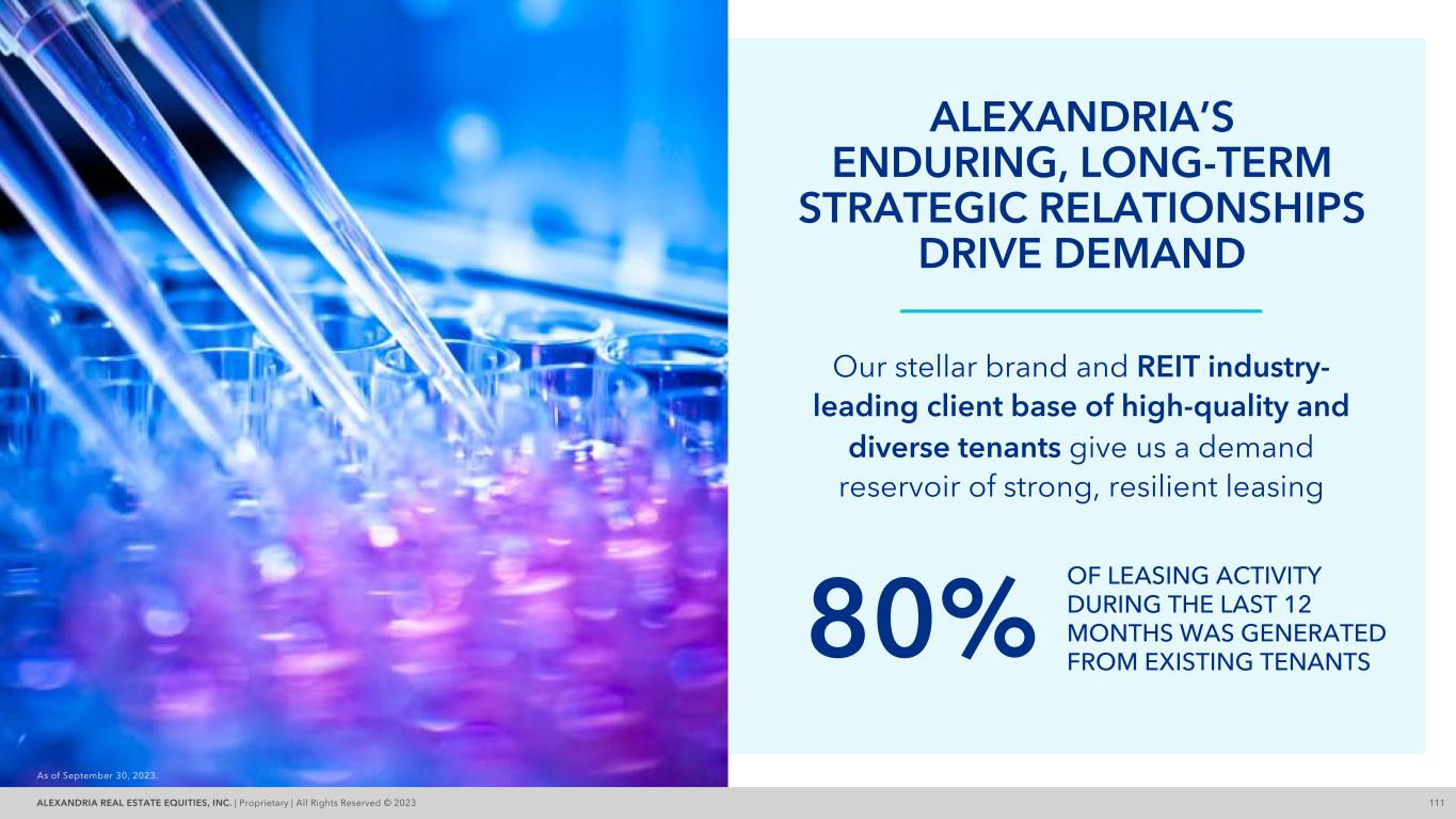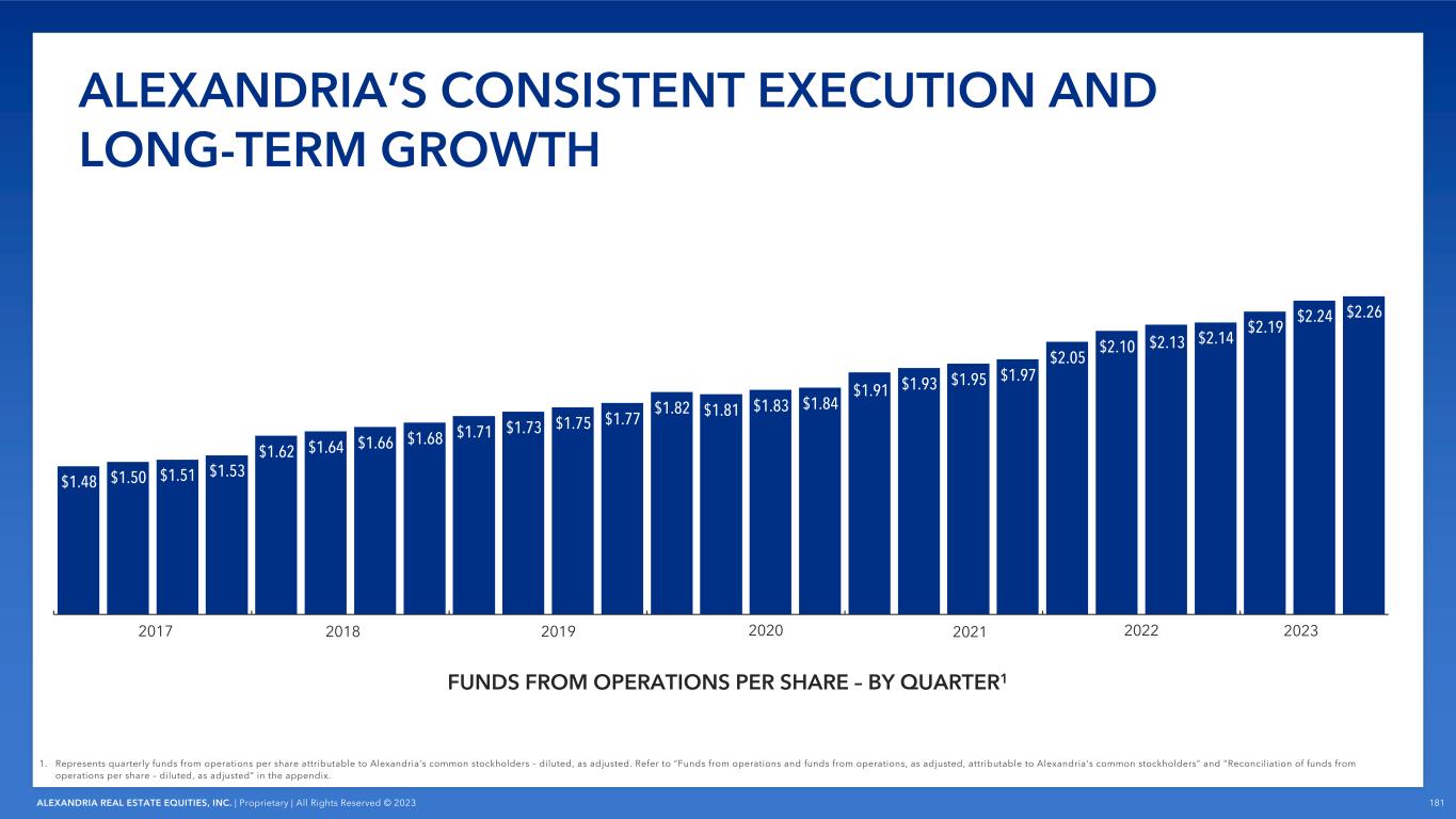 180ALEXANDRIA REAL ESTATE EQUITIES, INC. | Proprietary | All Rights Reserved © 2023 ALEXANDRIA’S DEMONSTRATED STRONG FUNDS FROM OPERATIONS PER-SHARE GROWTH Represents funds from operations per share attributable to Alexandria’s common stockholders – diluted, as adjusted. Refer to “Funds from operations and funds from operations, as adjusted, attributable to Alexandria's common stockholders” and ”Reconciliations of funds from operations per share – diluted, as adjusted.” 1. Represents the growth in funds from operations per share - diluted, as adjusted, at the midpoints of our guidance ranges for the year ending December 31, 2024 (disclosed on November 29, 2023) compared to the year ending December 31, 2023 (disclosed on October 23, 2023) . 2. Represents the midpoint of our 2023 guidance range of funds from operations per share – diluted, as adjusted, of $8.97 to $8.99 disclosed on October 23, 2023. 3. Represents the midpoint of our 2024 guidance range of funds from operations per share – diluted, as adjusted, of $9.37 to $9.57 disclosed on November 29, 2023. FUNDS FROM OPERATIONS PER SHARE – DILUTED, AS ADJUSTED $4.40 $4.80 $5.25 $5.51 $6.02 $6.60 $6.96 $7.30 $7.76 $8.42 $8.98 $9.47 2013 2014 2015 2016 2017 2018 2019 2020 2021 2022 2023 Projected² 2024 Projected³ 115% GROWTH CONTINUED STRONG FFO PER-SHARE GROWTH IN A CHALLENGING MACROENVIRONMENT Growth in FFO per Share (2024 over 2023) +5.5% 1