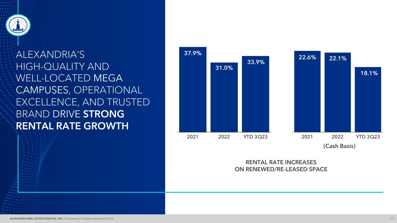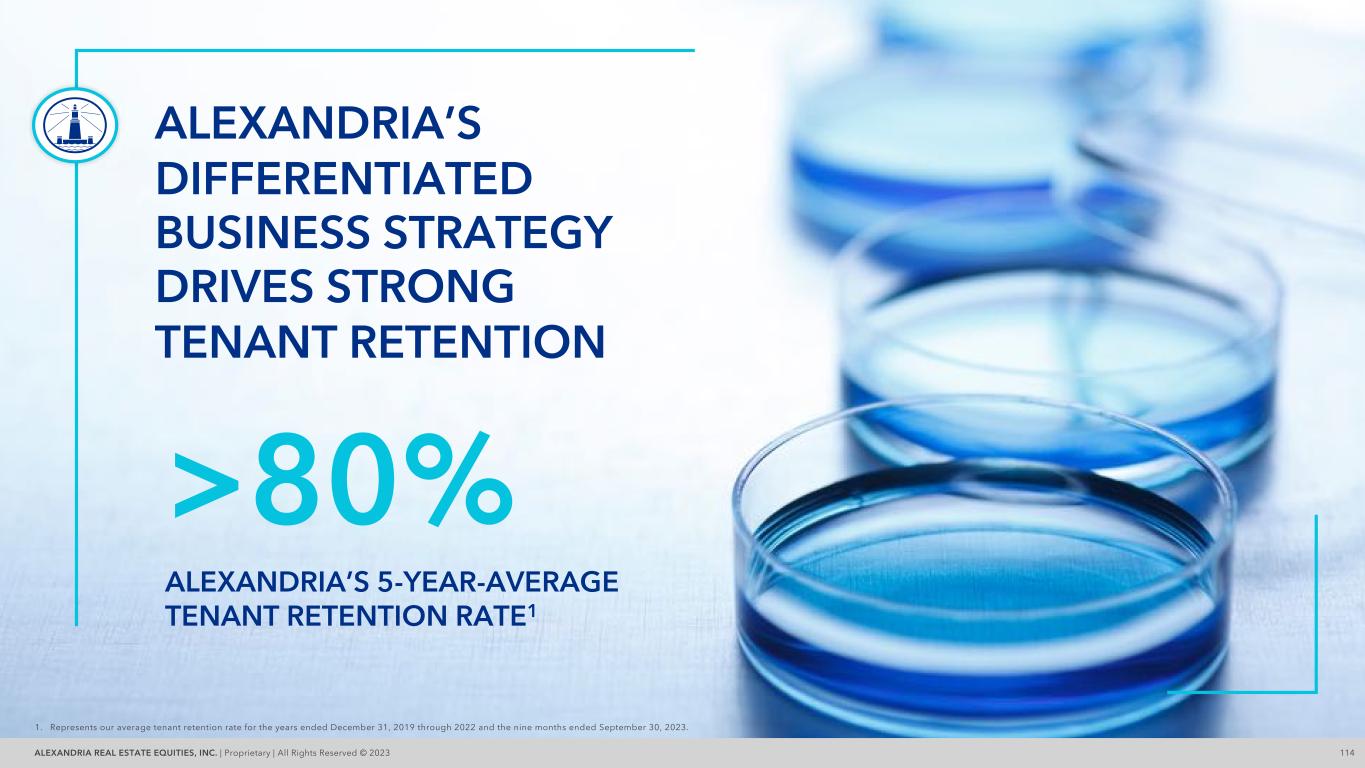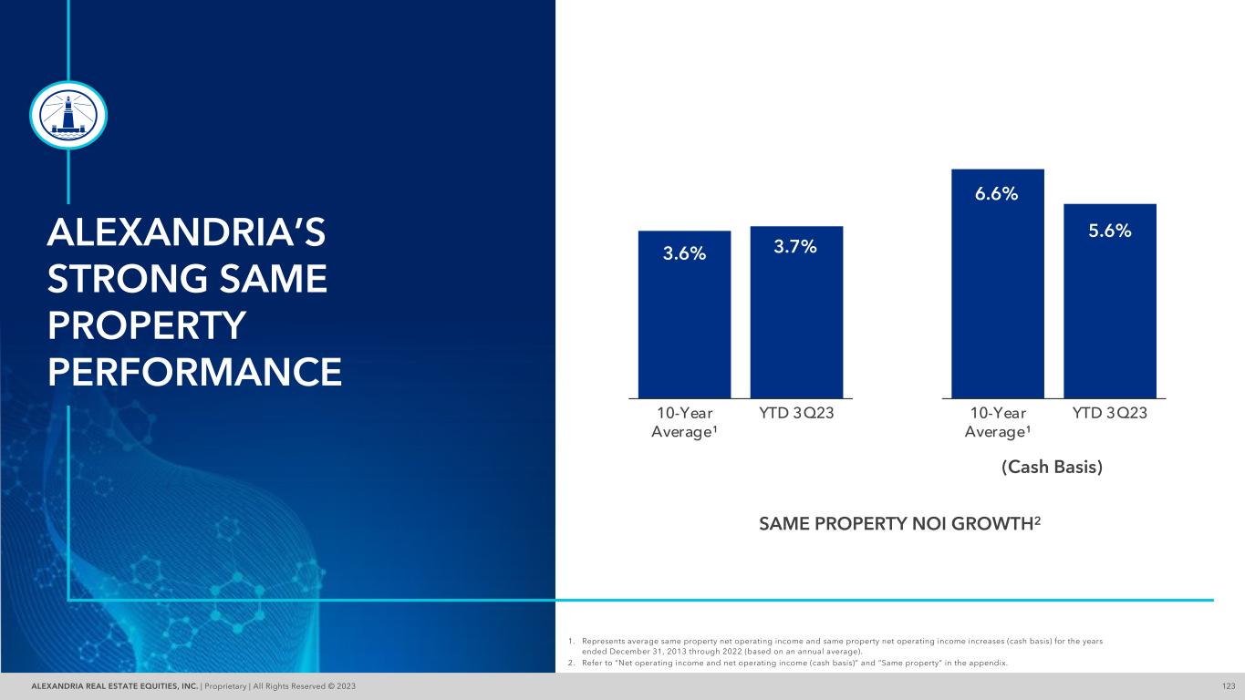 123ALEXANDRIA REAL ESTATE EQUITIES, INC. | Proprietary | All Rights Reserved © 2023 3.6% 3.7% 10-Year Average¹ YTD 3Q23 6.6% 5.6% 10-Year Average¹ YTD 3Q23 SAME PROPERTY NOI GROWTH2 1. Represents average same property net operating income and same property net operating income increases (cash basis) for the years ended December 31, 2013 through 2022 (based on an annual average). 2. Refer to “Net operating income and net operating income (cash basis)” and “Same property” in the appendix. ALEXANDRIA’S STRONG SAME PROPERTY PERFORMANCE (Cash Basis)