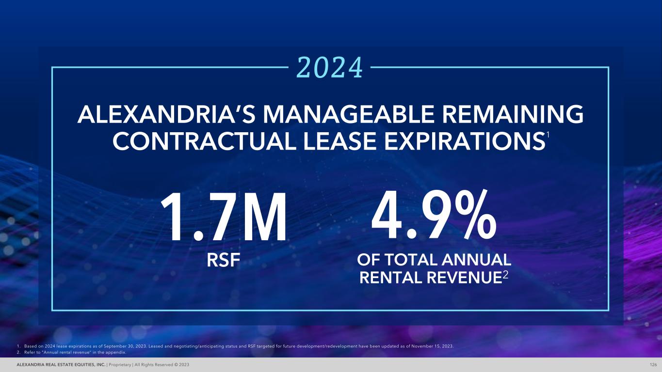 128ALEXANDRIA REAL ESTATE EQUITIES, INC. | Proprietary | All Rights Reserved © 2023 MARKET | SUBMARKET EXPIRATION RSF ANNUAL RENTAL REVENUE (PER RSF)2 RSF LEASED REMAINING EXPIRING LEASES Greater Boston | Cambridge/Inner Suburbs 1Q24 171,945 $64.43 — 171,945 San Francisco Bay Area | Mission Bay 3Q24 97,702 $63.73 — 97,702 Maryland | Gaithersburg 1Q24 89,831 $37.45 89,831 — Seattle | Bothell 3Q24 87,273 $22.33 — 87,273 Research Triangle | Research Triangle 1Q24 72,078 $42.96 72,078 — Greater Boston | Cambridge/Inner Suburbs 3Q24 63,017 $60.27 — 63,017 San Diego | Sorrento Mesa 1Q24 52,710 $37.23 — 52,710 Greater Boston | Cambridge/Inner Suburbs 3Q24 48,516 $70.12 — 48,516 San Francisco Bay Area | Mission Bay 3Q24 45,670 $78.75 — 45,670 Greater Boston | Fenway 1Q24 45,375 $69.17 — 45,375 Total RSF 774,117 161,909 612,208 Total % 100% 21% 79% ALEXANDRIA’S MANAGEABLE 2024 TOP 10 LEASE EXPIRATIONS1 1. Based on 2024 lease expirations as of September 30, 2023. Leased and negotiating/anticipating status and RSF targeted for future development/redevelopment have been updated as of November 15, 2023. 2. Refer to “Annual rental revenue“ in the appendix. , , Excludes Spaces Targeted for Future Development/Redevelopment