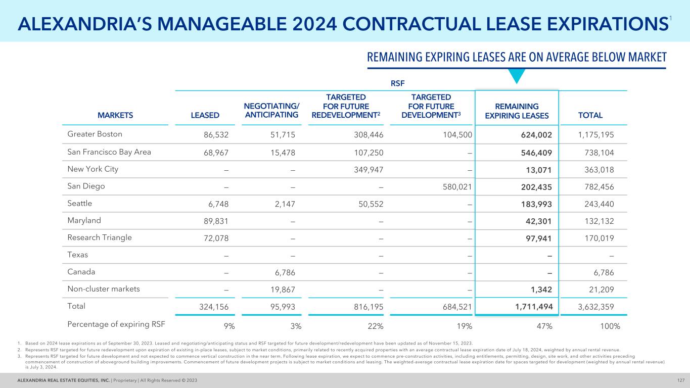 127ALEXANDRIA REAL ESTATE EQUITIES, INC. | Proprietary | All Rights Reserved © 2023 RSF MARKETS LEASED NEGOTIATING/ ANTICIPATING TARGETED FOR FUTURE REDEVELOPMENT2 TARGETED FOR FUTURE DEVELOPMENT3 TOTAL Greater Boston 86,532 51,715 308,446 104,500 1,175,195 San Francisco Bay Area 68,967 15,478 107,250 — 738,104 New York City — — 349,947 — 363,018 San Diego — — — 580,021 782,456 Seattle 6,748 2,147 50,552 — 243,440 Maryland 89,831 — — — 132,132 Research Triangle 72,078 — — — 170,019 Texas — — — — — Canada — 6,786 — — 6,786 Non-cluster markets — 19,867 — — 21,209 Total 324,156 95,993 816,195 684,521 3,632,359 Percentage of expiring RSF 9% 3% 22% 19% 47% 100% ALEXANDRIA’S MANAGEABLE 2024 CONTRACTUAL LEASE EXPIRATIONS1 1. Based on 2024 lease expirations as of September 30, 2023. Leased and negotiating/anticipating status and RSF targeted for future development/redevelopment have been updated as of November 15, 2023. 2. Represents RSF targeted for future redevelopment upon expiration of existing in-place leases, subject to market conditions, primarily related to recently acquired properties with an average contractual lease expiration date of July 18, 2024, weighted by annual rental revenue. 3. Represents RSF targeted for future development and not expected to commence vertical construction in the near term. Following lease expiration, we expect to commence pre-construction activities, including entitlements, permitting, design, site work, and other activities preceding commencement of construction of aboveground building improvements. Commencement of future development projects is subject to market conditions and leasing. The weighted-average contractual lease expiration date for spaces targeted for development (weighted by annual rental revenue) is July 3, 2024. REMAINING EXPIRING LEASES 624,002 546,409 13,071 202,435 183,993 42,301 97,941 — — 1,342 1,711,494 REMAINING EXPIRING LEASES ARE ON AVERAGE BELOW MARKET