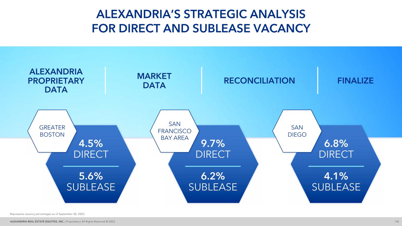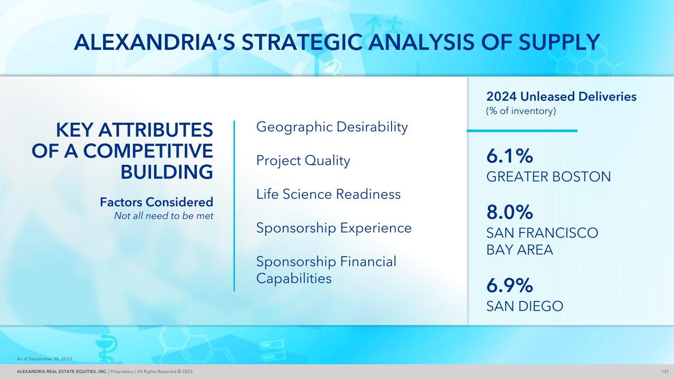 130ALEXANDRIA REAL ESTATE EQUITIES, INC. | Proprietary | All Rights Reserved © 2023 ALEXANDRIA’S STRATEGIC ANALYSIS FOR DIRECT AND SUBLEASE VACANCY Represents vacancy percentages as of September 30, 2023. ALEXANDRIA PROPRIETARY DATA MARKET DATA RECONCILIATION FINALIZE GREATER BOSTON SAN FRANCISCO BAY AREA SAN DIEGO 4.5% DIRECT 5.6% SUBLEASE 9.7% DIRECT 6.2% SUBLEASE 6.8% DIRECT 4.1% SUBLEASE