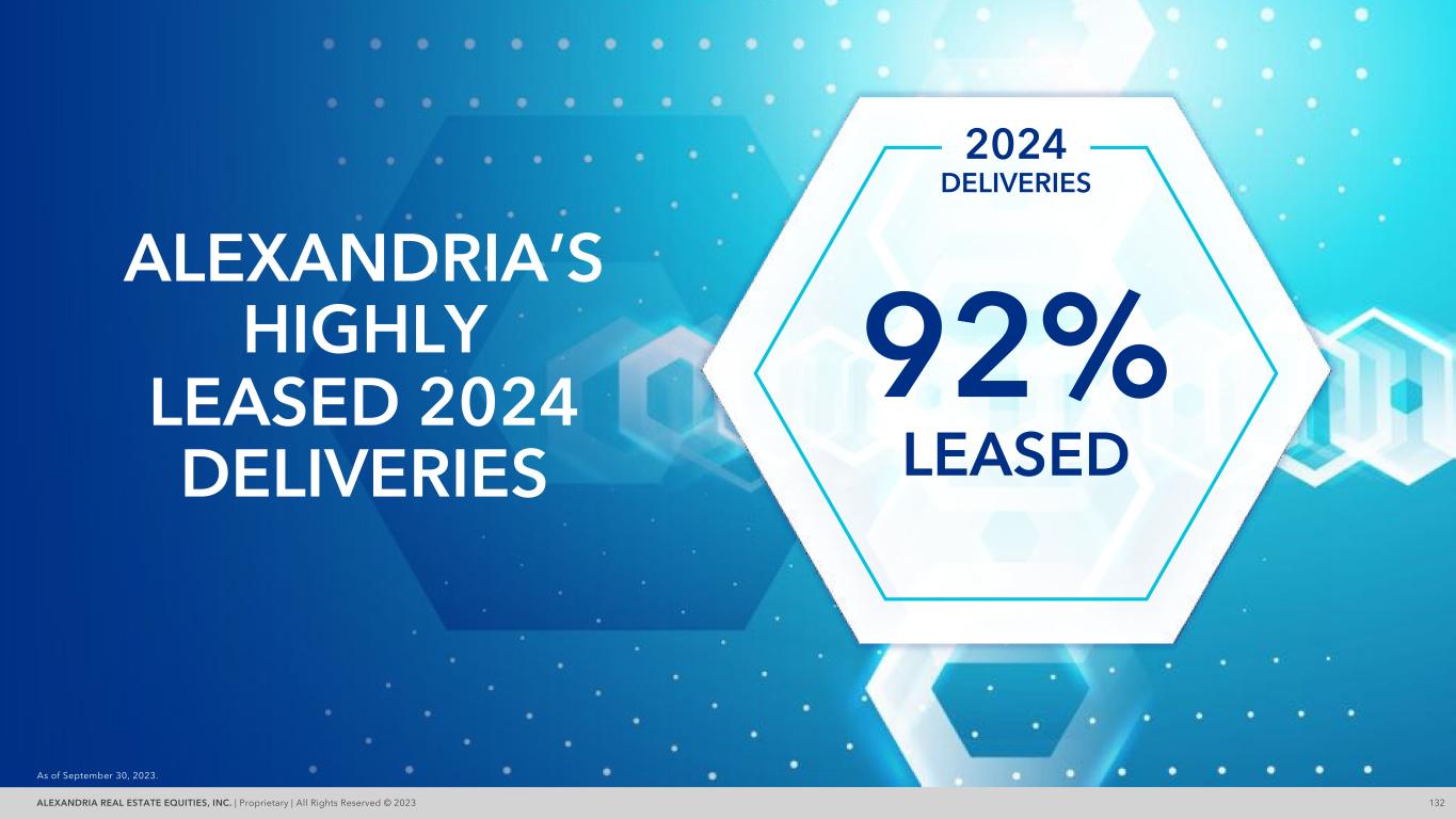 132ALEXANDRIA REAL ESTATE EQUITIES, INC. | Proprietary | All Rights Reserved © 2023 2024 DELIVERIES 92% LEASED ALEXANDRIA’S HIGHLY LEASED 2024 DELIVERIES As of September 30, 2023.