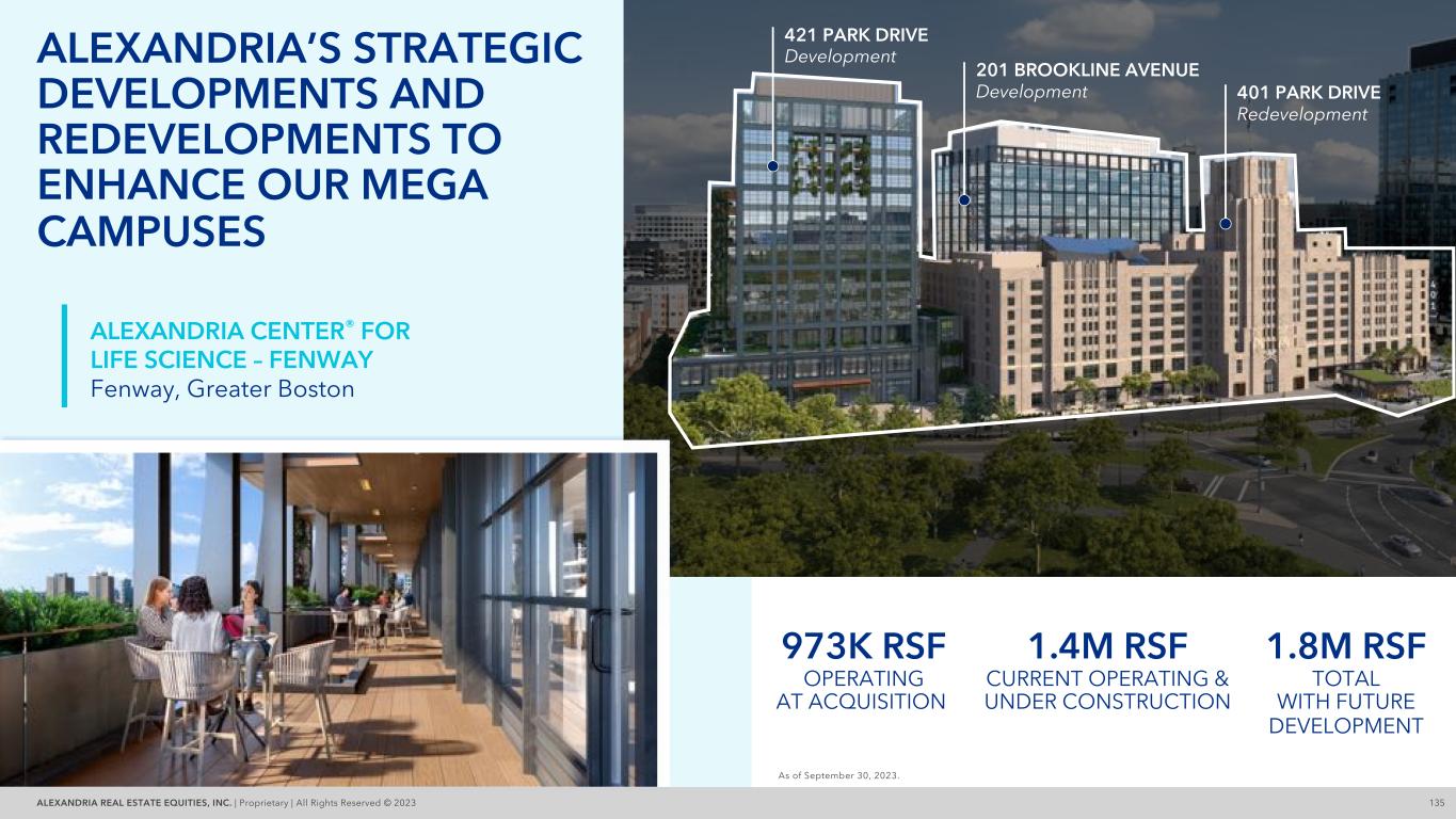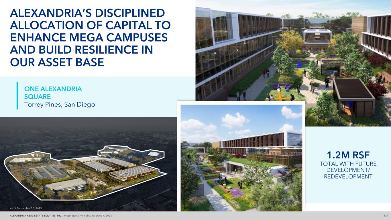 134ALEXANDRIA REAL ESTATE EQUITIES, INC. | Proprietary | All Rights Reserved © 2023 ALEXANDRIA’S DISCIPLINED ALLOCATION OF CAPITAL TO ENHANCE MEGA CAMPUSES AND BUILD RESILIENCE IN OUR ASSET BASE ONE ALEXANDRIA SQUARE Torrey Pines, San Diego 1.2M RSF TOTAL WITH FUTURE DEVELOPMENT/ REDEVELOPMENT As of September 30, 2023.