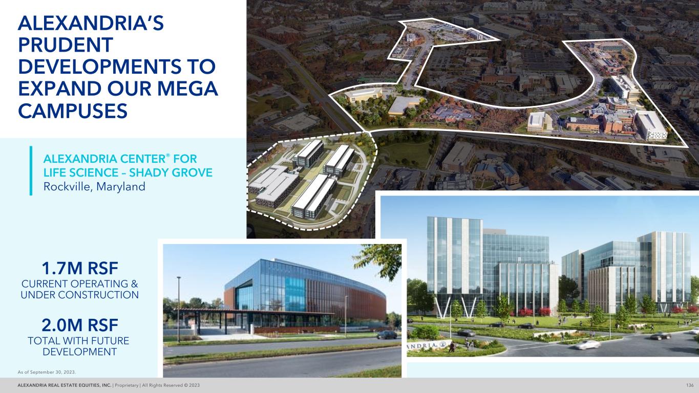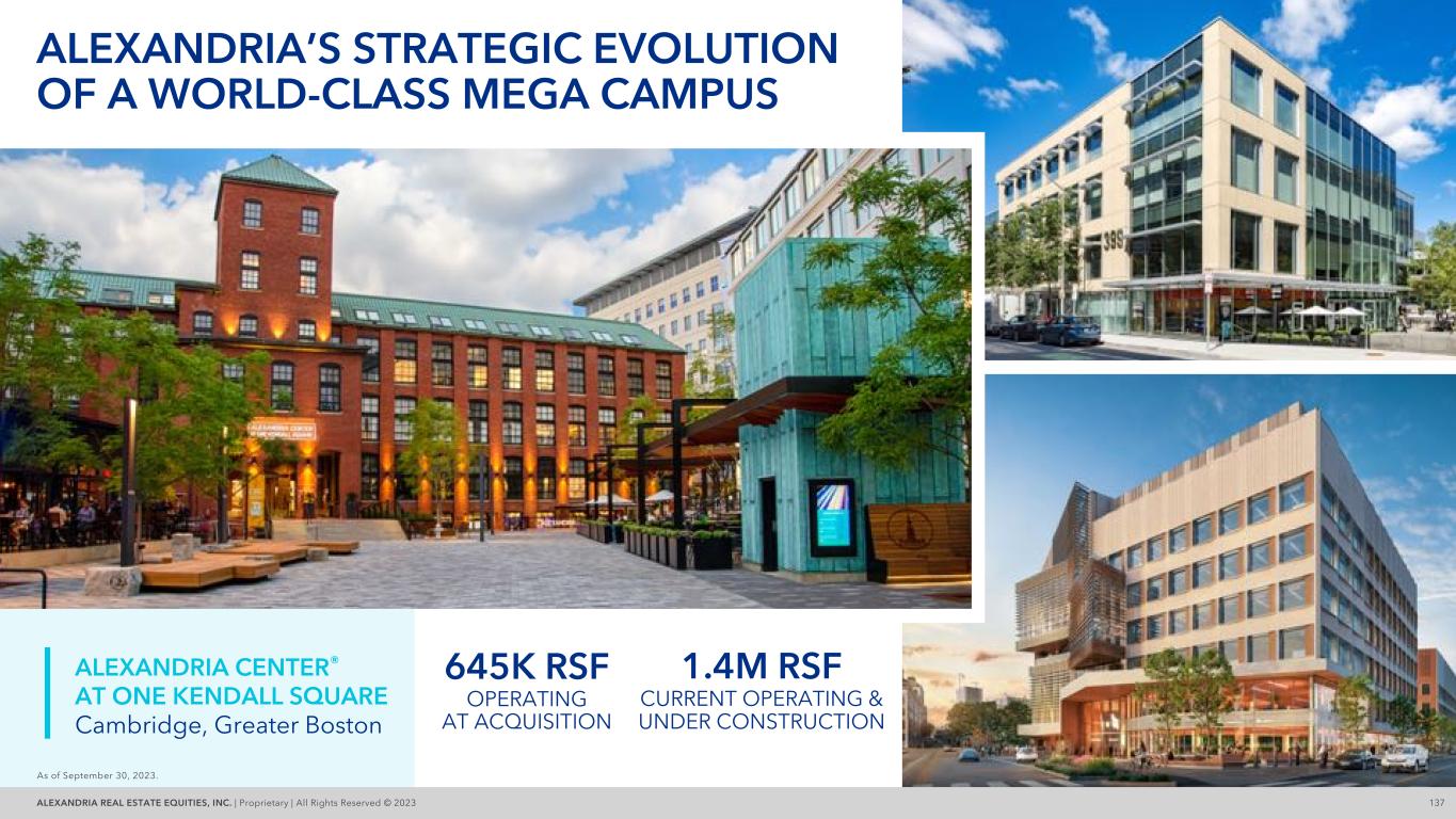 136ALEXANDRIA REAL ESTATE EQUITIES, INC. | Proprietary | All Rights Reserved © 2023 As of September 30, 2023. ALEXANDRIA’S PRUDENT DEVELOPMENTS TO EXPAND OUR MEGA CAMPUSES 1.7M RSF CURRENT OPERATING & UNDER CONSTRUCTION 2.0M RSF TOTAL WITH FUTURE DEVELOPMENT ALEXANDRIA CENTER® FOR LIFE SCIENCE – SHADY GROVE Rockville, Maryland