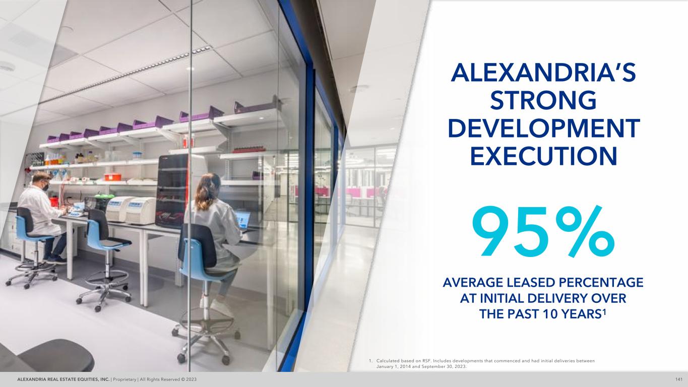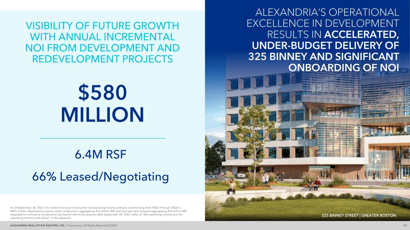 140ALEXANDRIA REAL ESTATE EQUITIES, INC. | Proprietary | All Rights Reserved © 2023 As of September 30, 2023. Our share of annual incremental net operating income primarily commencing from 4Q23 through 3Q26 is $491 million. Represents projects under construction aggregating 5.6 million RSF and two near-term projects aggregating 0.8 million RSF expected to commence construction during the next three quarters after September 30, 2023. Refer to "Net operating income and net operating income (cash basis)" in the appendix. ALEXANDRIA’S OPERATIONAL EXCELLENCE IN DEVELOPMENT RESULTS IN ACCELERATED, UNDER-BUDGET DELIVERY OF 325 BINNEY AND SIGNIFICANT ONBOARDING OF NOI VISIBILITY OF FUTURE GROWTH WITH ANNUAL INCREMENTAL NOI FROM DEVELOPMENT AND REDEVELOPMENT PROJECTS 325 BINNEY STREET | GREATER BOSTON $580 MILLION 6.4M RSF 66% Leased/Negotiating