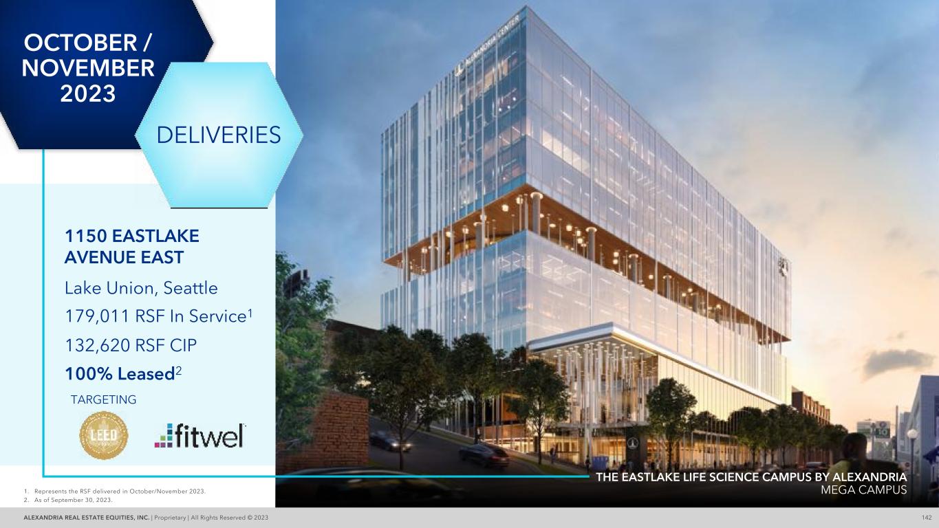 142ALEXANDRIA REAL ESTATE EQUITIES, INC. | Proprietary | All Rights Reserved © 2023 1. Represents the RSF delivered in October/November 2023. 2. As of September 30, 2023. THE EASTLAKE LIFE SCIENCE CAMPUS BY ALEXANDRIA MEGA CAMPUS DELIVERIES OCTOBER / NOVEMBER 2023 1150 EASTLAKE AVENUE EAST Lake Union, Seattle 179,011 RSF In Service1 132,620 RSF CIP 100% Leased2 TARGETING