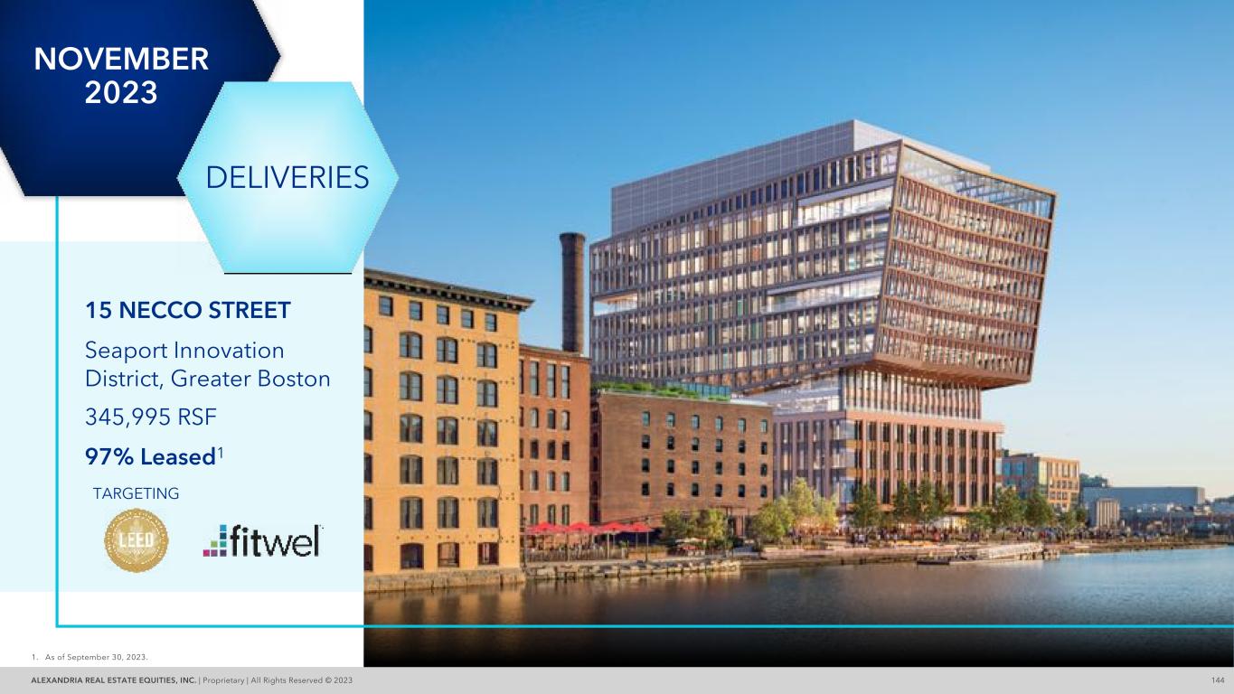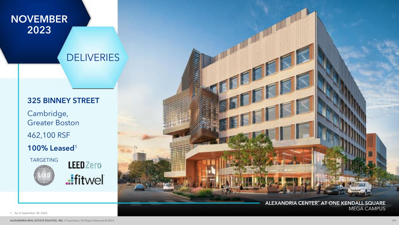 143ALEXANDRIA REAL ESTATE EQUITIES, INC. | Proprietary | All Rights Reserved © 2023 1. As of September 30, 2023. 325 BINNEY STREET Cambridge, Greater Boston 462,100 RSF 100% Leased1 TARGETING DELIVERIES NOVEMBER 2023 ALEXANDRIA CENTER® AT ONE KENDALL SQUARE MEGA CAMPUS