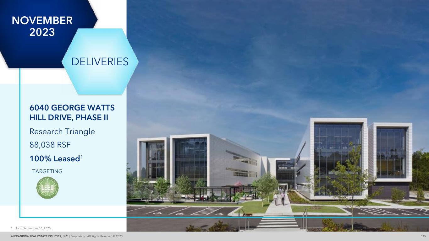 145ALEXANDRIA REAL ESTATE EQUITIES, INC. | Proprietary | All Rights Reserved © 2023 1. As of September 30, 2023. DELIVERIES NOVEMBER 2023 6040 GEORGE WATTS HILL DRIVE, PHASE II Research Triangle 88,038 RSF 100% Leased1 TARGETING