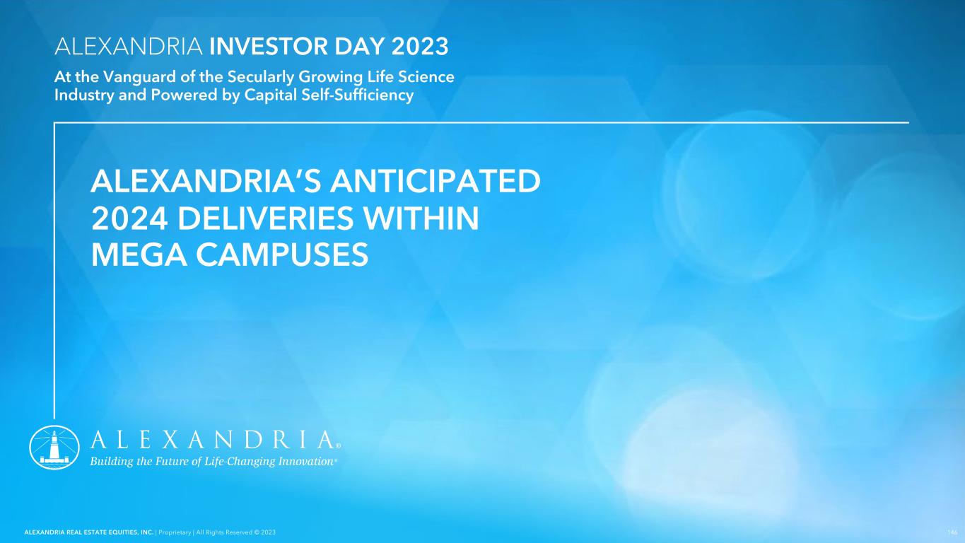 146ALEXANDRIA REAL ESTATE EQUITIES, INC. | Proprietary | All Rights Reserved © 2023 ALEXANDRIA INVESTOR DAY 2023 At the Vanguard of the Secularly Growing Life Science Industry and Powered by Capital Self-Sufficiency ALEXANDRIA’S ANTICIPATED 2024 DELIVERIES WITHIN MEGA CAMPUSES