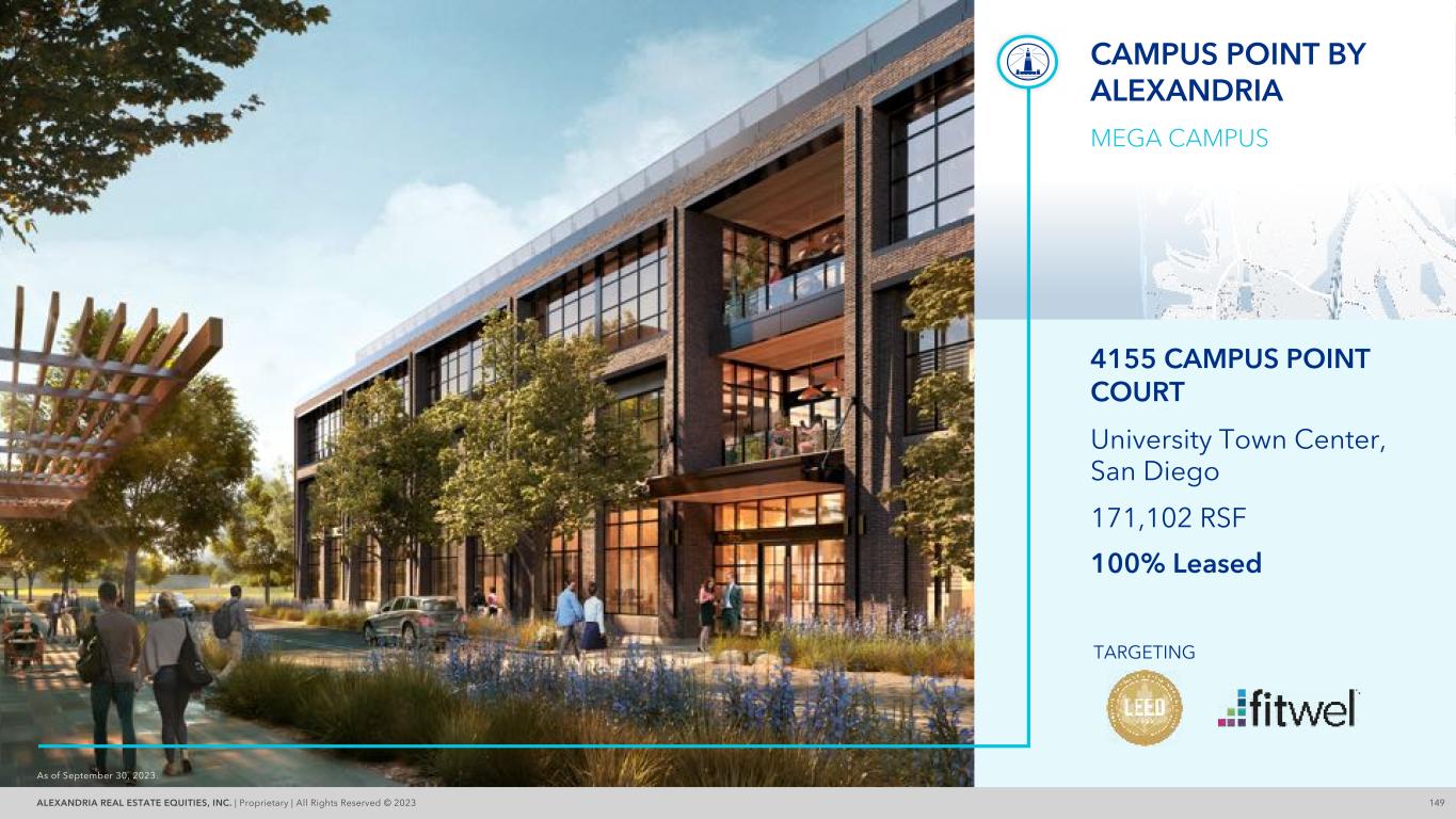 149ALEXANDRIA REAL ESTATE EQUITIES, INC. | Proprietary | All Rights Reserved © 2023 4155 CAMPUS POINT COURT University Town Center, San Diego 171,102 RSF 100% Leased TARGETING CAMPUS POINT BY ALEXANDRIA MEGA CAMPUS As of September 30, 2023.