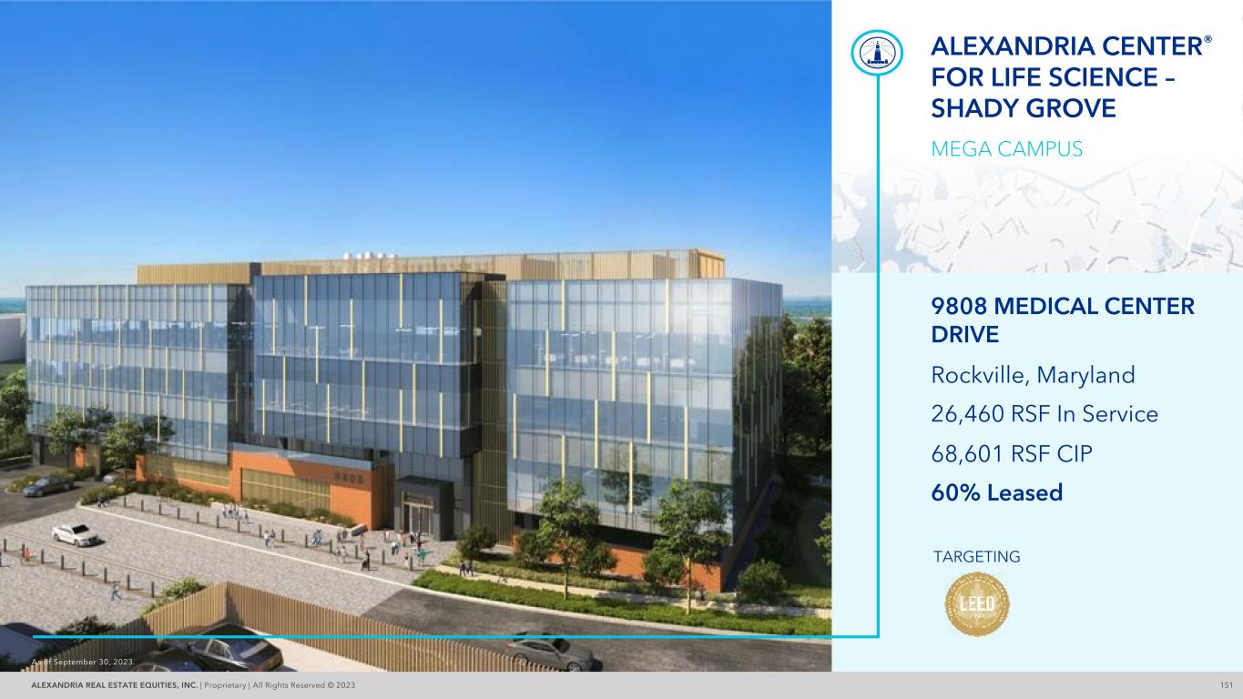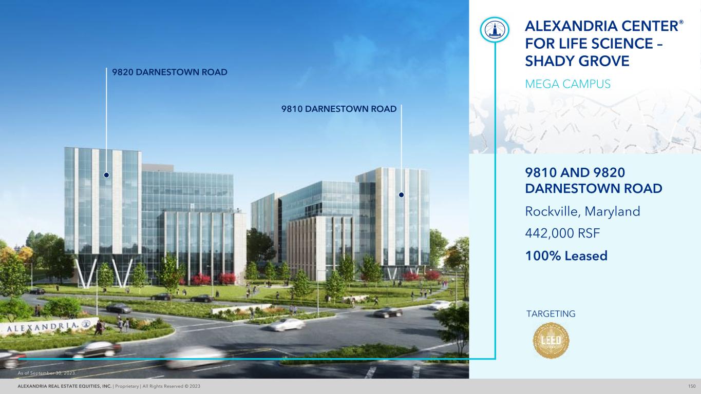 150ALEXANDRIA REAL ESTATE EQUITIES, INC. | Proprietary | All Rights Reserved © 2023 9810 AND 9820 DARNESTOWN ROAD Rockville, Maryland 442,000 RSF 100% Leased TARGETING ALEXANDRIA CENTER® FOR LIFE SCIENCE – SHADY GROVE MEGA CAMPUS 9810 DARNESTOWN ROAD 9820 DARNESTOWN ROAD As of September 30, 2023.