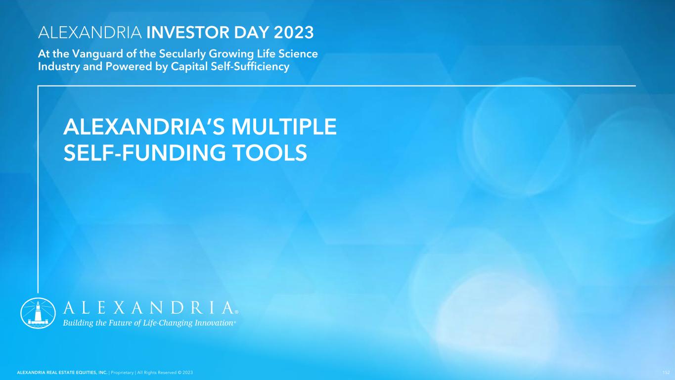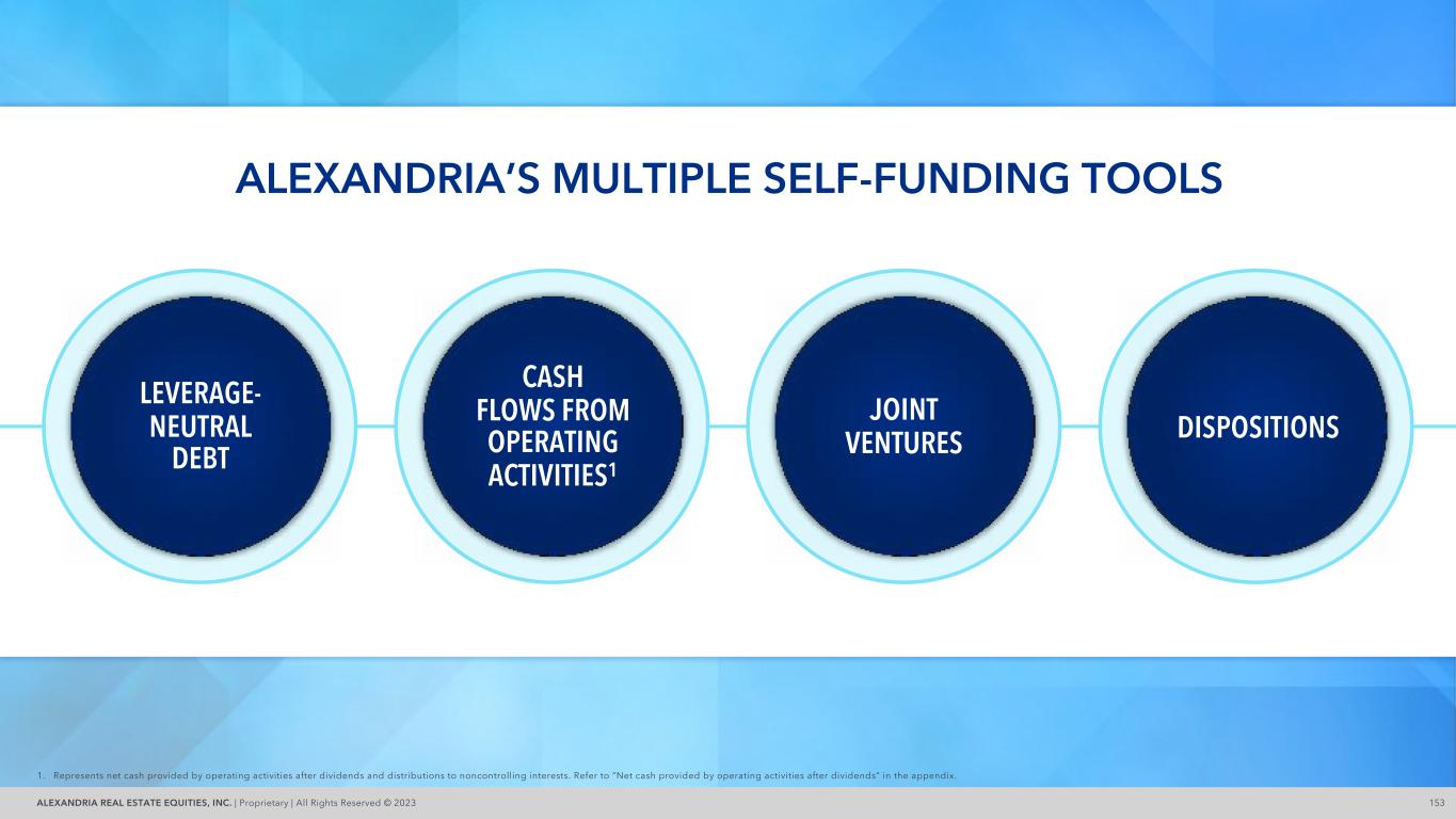 152ALEXANDRIA REAL ESTATE EQUITIES, INC. | Proprietary | All Rights Reserved © 2023 ALEXANDRIA INVESTOR DAY 2023 At the Vanguard of the Secularly Growing Life Science Industry and Powered by Capital Self-Sufficiency ALEXANDRIA’S MULTIPLE SELF-FUNDING TOOLS