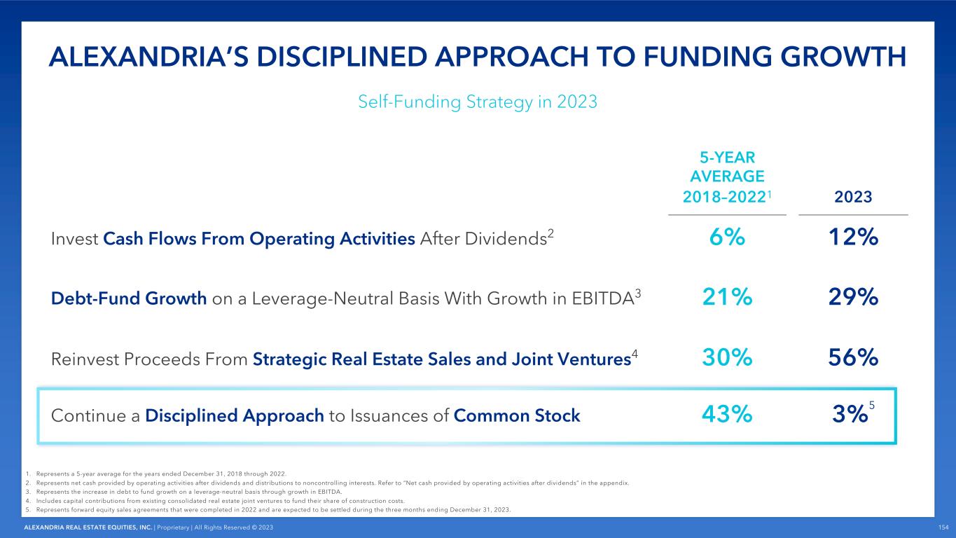 153ALEXANDRIA REAL ESTATE EQUITIES, INC. | Proprietary | All Rights Reserved © 2023 1. Represents net cash provided by operating activities after dividends and distributions to noncontrolling interests. Refer to “Net cash provided by operating activities after dividends” in the appendix. ALEXANDRIA’S MULTIPLE SELF-FUNDING TOOLS CASH FLOWS FROM OPERATING ACTIVITIES1 LEVERAGE- NEUTRAL DEBT JOINT VENTURES DISPOSITIONS
