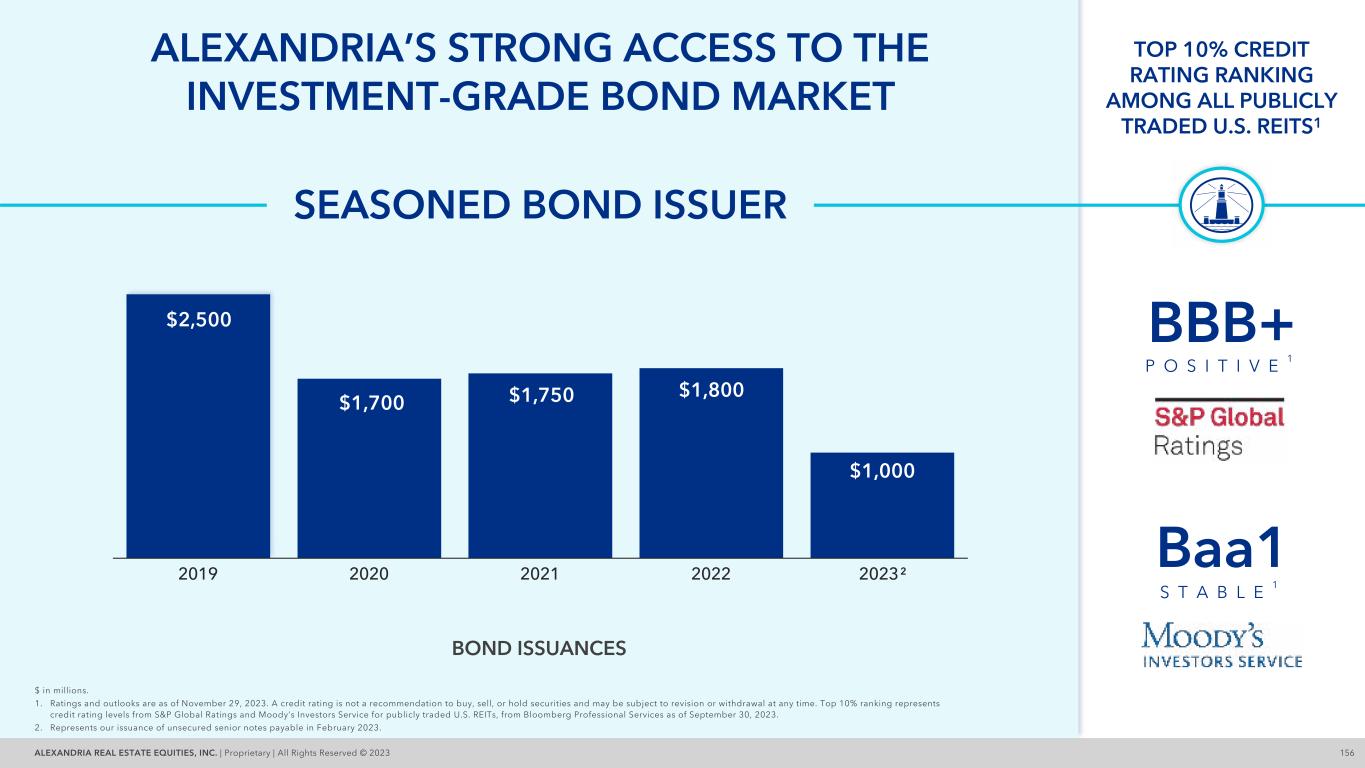 156ALEXANDRIA REAL ESTATE EQUITIES, INC. | Proprietary | All Rights Reserved © 2023 ALEXANDRIA’S STRONG ACCESS TO THE INVESTMENT-GRADE BOND MARKET $ in millions. 1. Ratings and outlooks are as of November 29, 2023. A credit rating is not a recommendation to buy, sell, or hold securities and may be subject to revision or withdrawal at any time. Top 10% ranking represents credit rating levels from S&P Global Ratings and Moody’s Investors Service for publicly traded U.S. REITs, from Bloomberg Professional Services as of September 30, 2023. 2. Represents our issuance of unsecured senior notes payable in February 2023. $2,500 $1,700 $1,750 $1,800 $1,000 2019 2020 2021 2022 2023² BOND ISSUANCES S T A B L E 1 Baa1 P O S I T I V E 1 BBB+ SEASONED BOND ISSUER TOP 10% CREDIT RATING RANKING AMONG ALL PUBLICLY TRADED U.S. REITS1