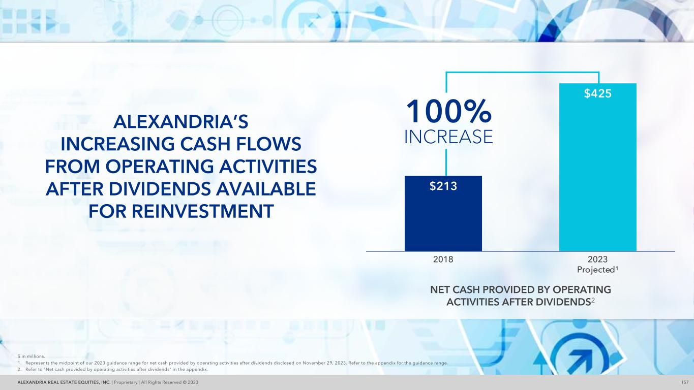 157ALEXANDRIA REAL ESTATE EQUITIES, INC. | Proprietary | All Rights Reserved © 2023 $213 $425 2018 2023 Projected¹ NET CASH PROVIDED BY OPERATING ACTIVITIES AFTER DIVIDENDS2 ALEXANDRIA’S INCREASING CASH FLOWS FROM OPERATING ACTIVITIES AFTER DIVIDENDS AVAILABLE FOR REINVESTMENT $ in millions. 1. Represents the midpoint of our 2023 guidance range for net cash provided by operating activities after dividends disclosed on November 29, 2023. Refer to the appendix for the guidance range. 2. Refer to “Net cash provided by operating activities after dividends” in the appendix. 100% INCREASE