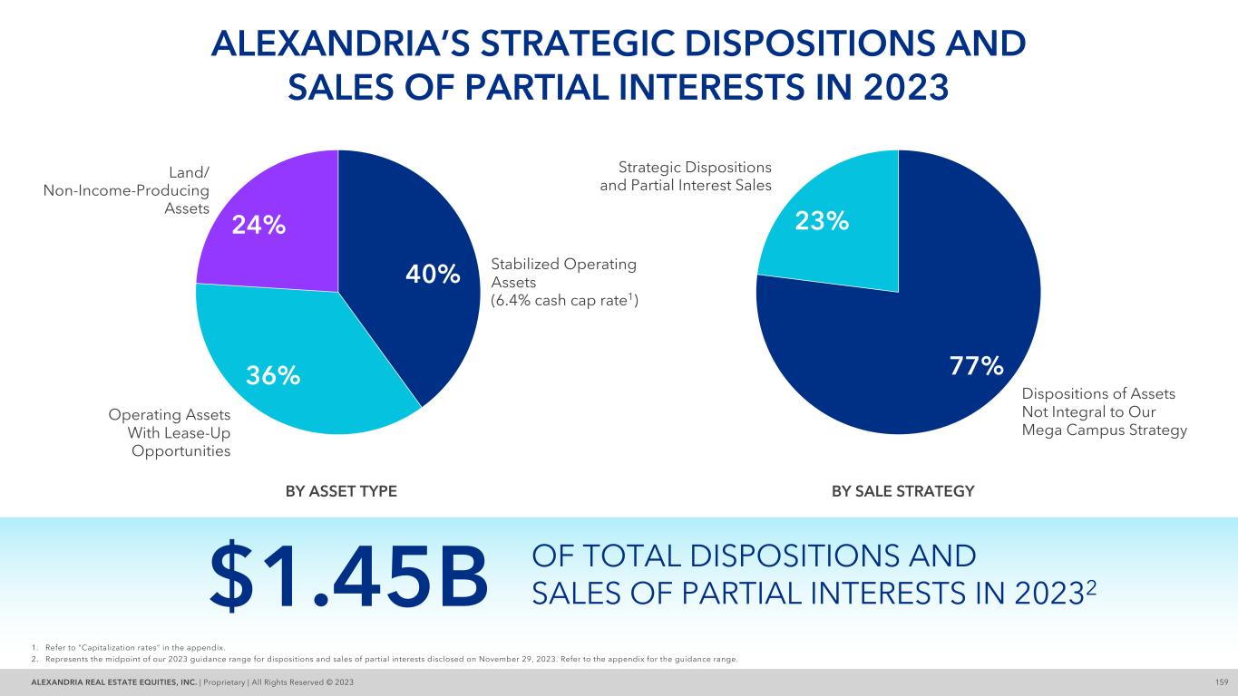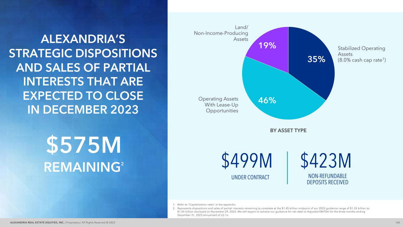 159ALEXANDRIA REAL ESTATE EQUITIES, INC. | Proprietary | All Rights Reserved © 2023 ALEXANDRIA’S STRATEGIC DISPOSITIONS AND SALES OF PARTIAL INTERESTS IN 2023 1. Refer to "Capitalization rates" in the appendix. 2. Represents the midpoint of our 2023 guidance range for dispositions and sales of partial interests disclosed on November 29, 2023. Refer to the appendix for the guidance range. OF TOTAL DISPOSITIONS AND SALES OF PARTIAL INTERESTS IN 20232$1.45B 77% 23% 40% 36% 24% Stabilized Operating Assets (6.4% cash cap rate1) BY SALE STRATEGYBY ASSET TYPE Operating Assets With Lease-Up Opportunities Land/ Non-Income-Producing Assets Strategic Dispositions and Partial Interest Sales Dispositions of Assets Not Integral to Our Mega Campus Strategy