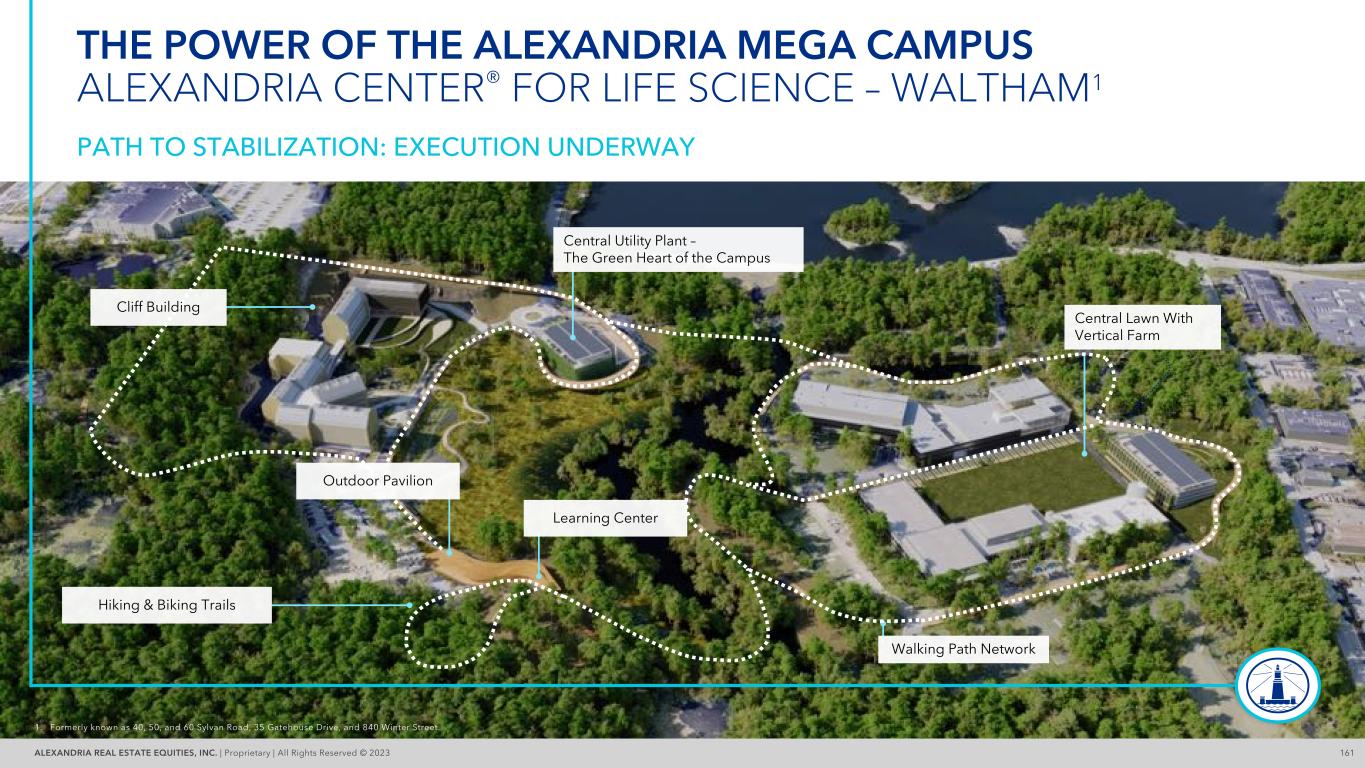 161ALEXANDRIA REAL ESTATE EQUITIES, INC. | Proprietary | All Rights Reserved © 2023 Central Utility Plant – The Green Heart of the Campus Hiking & Biking Trails Central Lawn With Vertical Farm Cliff Building Walking Path Network Learning Center Outdoor Pavilion THE POWER OF THE ALEXANDRIA MEGA CAMPUS ALEXANDRIA CENTER® FOR LIFE SCIENCE – WALTHAM1 PATH TO STABILIZATION: EXECUTION UNDERWAY 1. Formerly known as 40, 50, and 60 Sylvan Road, 35 Gatehouse Drive, and 840 Winter Street.