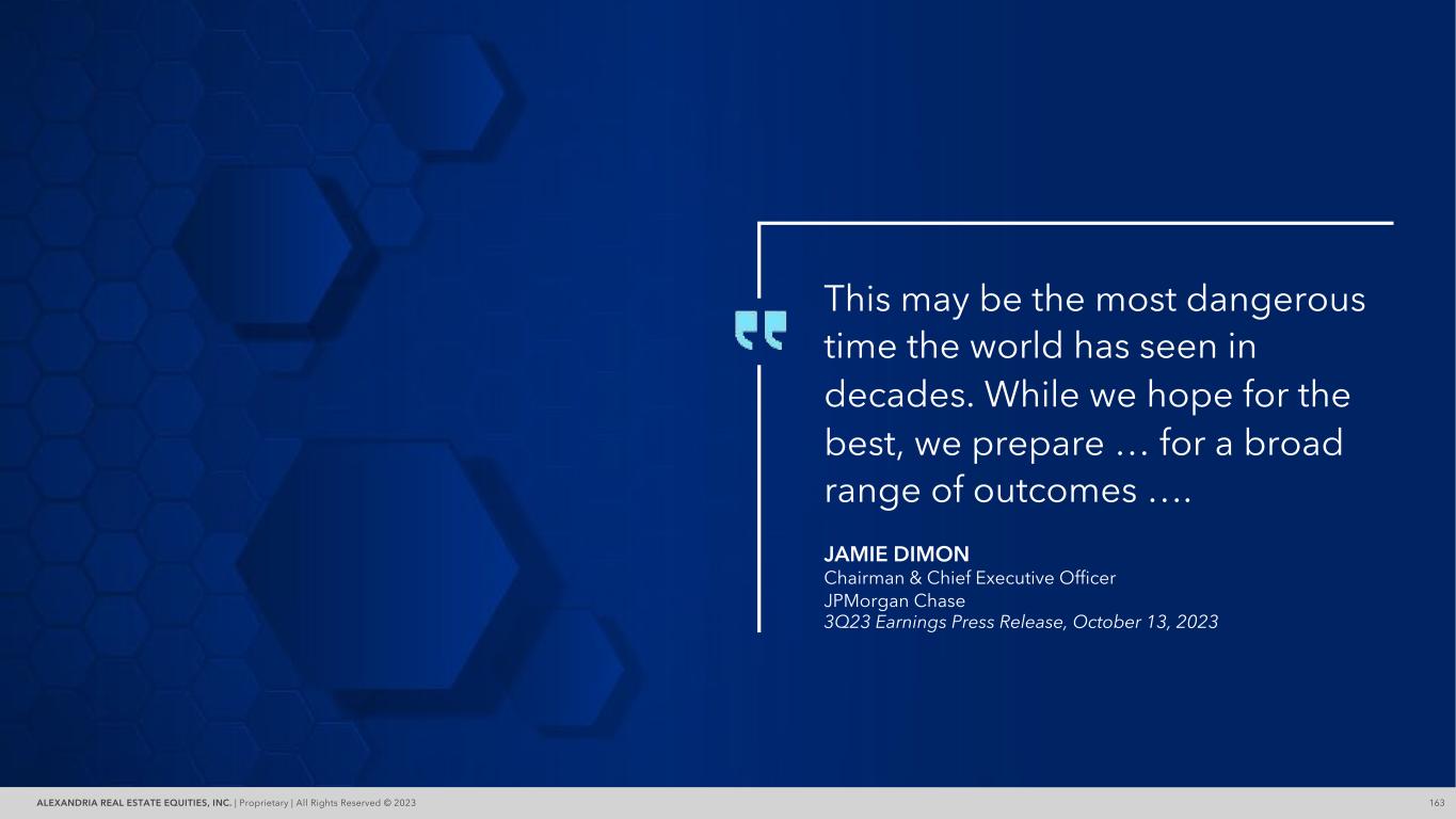 163ALEXANDRIA REAL ESTATE EQUITIES, INC. | Proprietary | All Rights Reserved © 2023 This may be the most dangerous time the world has seen in decades. While we hope for the best, we prepare … for a broad range of outcomes …. JAMIE DIMON Chairman & Chief Executive Officer JPMorgan Chase 3Q23 Earnings Press Release, October 13, 2023