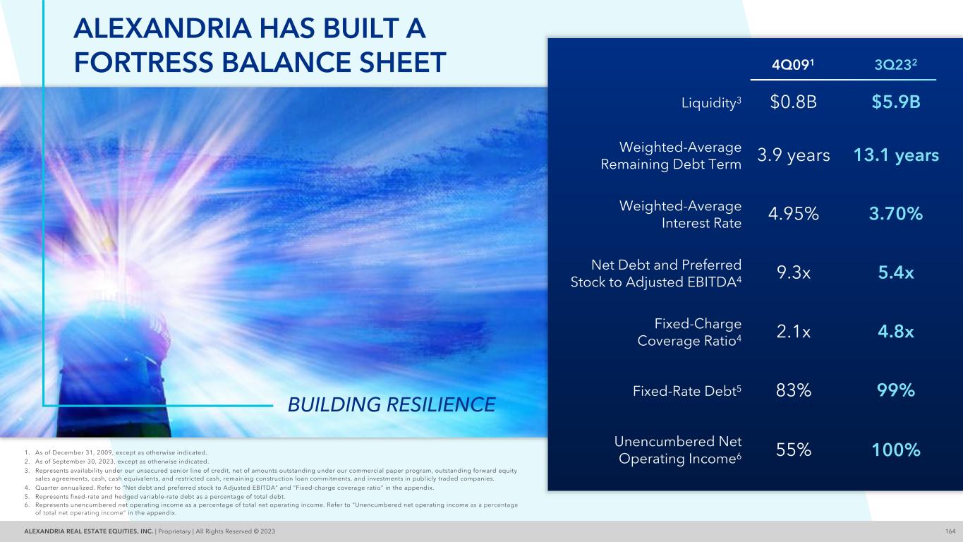 164ALEXANDRIA REAL ESTATE EQUITIES, INC. | Proprietary | All Rights Reserved © 2023 1. As of December 31, 2009, except as otherwise indicated. 2. As of September 30, 2023, except as otherwise indicated. 3. Represents availability under our unsecured senior line of credit, net of amounts outstanding under our commercial paper program, outstanding forward equity sales agreements, cash, cash equivalents, and restricted cash, remaining construction loan commitments, and investments in publicly traded companies. 4. Quarter annualized. Refer to “Net debt and preferred stock to Adjusted EBITDA” and “Fixed-charge coverage ratio” in the appendix. 5. Represents fixed-rate and hedged variable-rate debt as a percentage of total debt. 6. Represents unencumbered net operating income as a percentage of total net operating income. Refer to “Unencumbered net operating income as a percentage of total net operating income” in the appendix. ALEXANDRIA HAS BUILT A FORTRESS BALANCE SHEET Liquidity3 $5.9B$0.8B Weighted-Average Remaining Debt Term 13.1 years3.9 years Weighted-Average Interest Rate 3.70%4.95% Net Debt and Preferred Stock to Adjusted EBITDA4 5.4x9.3x Fixed-Charge Coverage Ratio4 4.8x2.1x Fixed-Rate Debt5 99%83% Unencumbered Net Operating Income6 100% 3Q2324Q091 55% BUILDING RESILIENCE
