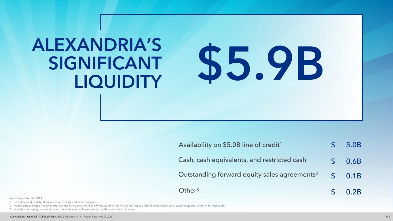 165ALEXANDRIA REAL ESTATE EQUITIES, INC. | Proprietary | All Rights Reserved © 2023 As of or through September 30, 2023. 1. Represents the midpoint of our 2023 guidance range for dispositions and sales of partial interests disclosed on November 29, 2023. Refer to the appendix for the guidance range. 2. Represents contributions from existing consolidated real estate joint ventures to fund their share of construction costs from 4Q23 through 2026. 3. Represents our guidance for net debt and preferred stock to Adjusted EBITDA for the three months ending December 31, 2023 annualized, disclosed on November 29, 2023. Refer to “Net debt and preferred stock to Adjusted EBITDA“ in the appendix. ALEXANDRIA’S IMPRESSIVE KEY BALANCE SHEET ACCOMPLISHMENTS IN 2023 SELF-FUNDED THROUGH $1.45B OF DISPOSITIONS AND SALES OF PARTIAL INTERESTS1 SIGNIFICANT LIQUIDITY OF $5.9B INCREASED LINE OF CREDIT CAPACITY BY 25% TO $5.0B BOND ISSUANCE OF $1.0B AT 4.95% FOR AVERAGE TERM OF 21 YEARS LOW LEVERAGE AT ≤5.1x3 $1.2B OF JV COMMITMENTS TO FUND FUTURE CONSTRUCTION2