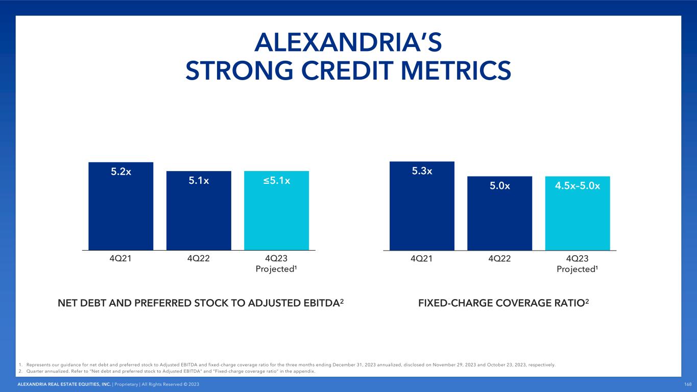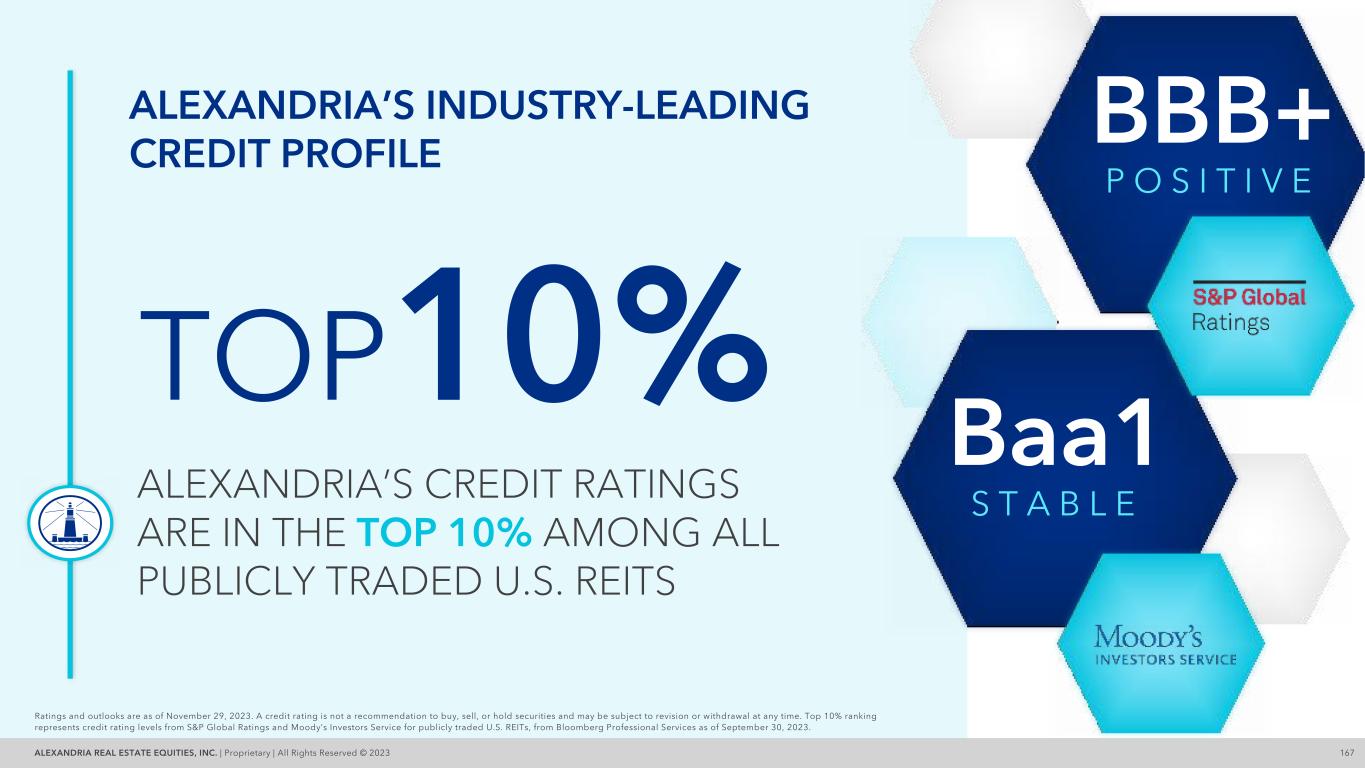 167ALEXANDRIA REAL ESTATE EQUITIES, INC. | Proprietary | All Rights Reserved © 2023 TOP10% ALEXANDRIA’S INDUSTRY-LEADING CREDIT PROFILE ALEXANDRIA’S CREDIT RATINGS ARE IN THE TOP 10% AMONG ALL PUBLICLY TRADED U.S. REITS S T A B L E Baa1 P O S I T I V E BBB+ Ratings and outlooks are as of November 29, 2023. A credit rating is not a recommendation to buy, sell, or hold securities and may be subject to revision or withdrawal at any time. Top 10% ranking represents credit rating levels from S&P Global Ratings and Moody’s Investors Service for publicly traded U.S. REITs, from Bloomberg Professional Services as of September 30, 2023.