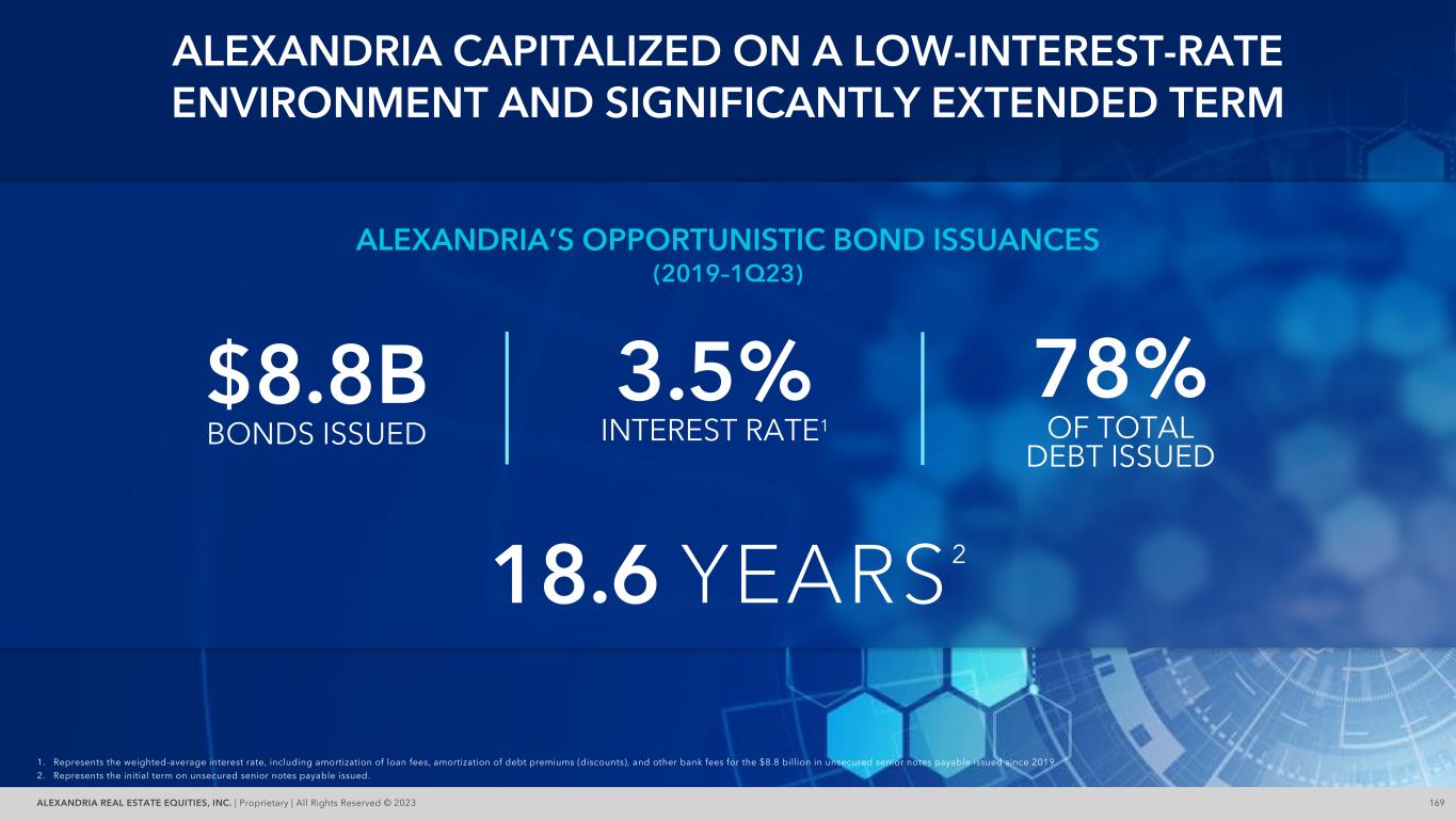 168ALEXANDRIA REAL ESTATE EQUITIES, INC. | Proprietary | All Rights Reserved © 2023 5.2x 5.1x ≤5.1x 4Q21 4Q22 4Q23 Projected¹ 1. Represents our guidance for net debt and preferred stock to Adjusted EBITDA and fixed-charge coverage ratio for the three months ending December 31, 2023 annualized, disclosed on November 29, 2023 and October 23, 2023, respectively. 2. Quarter annualized. Refer to “Net debt and preferred stock to Adjusted EBITDA“ and “Fixed-charge coverage ratio“ in the appendix. ALEXANDRIA’S STRONG CREDIT METRICS NET DEBT AND PREFERRED STOCK TO ADJUSTED EBITDA2 FIXED-CHARGE COVERAGE RATIO2 5.3x 5.0x 4.5x–5.0x 4Q21 4Q22 4Q23 Projected¹