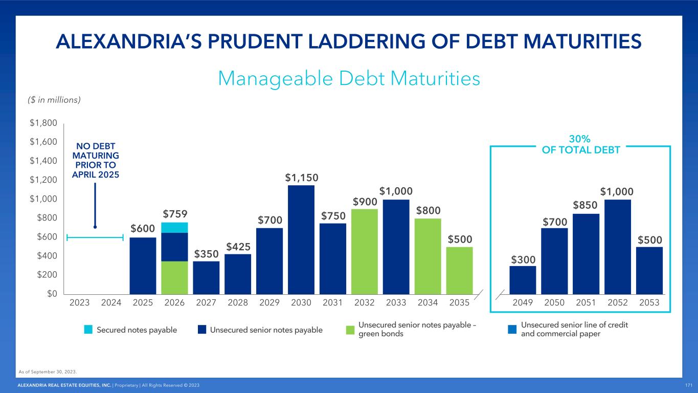 171ALEXANDRIA REAL ESTATE EQUITIES, INC. | Proprietary | All Rights Reserved © 2023 As of September 30, 2023. ALEXANDRIA’S PRUDENT LADDERING OF DEBT MATURITIES Manageable Debt Maturities $800 $300 $759 $350 $425 $700 $1,150 $750 $900 $1,000 $500 $700 $850 $1,000 $500 $0 $200 $400 $600 $800 $1,000 $1,200 $1,400 $1,600 $1,800 2023 2024 2025 2026 2027 2028 2029 2030 2031 2032 2033 2034 2035 2049 2050 2051 2052 2053 Secured notes payable Unsecured senior notes payable Unsecured senior notes payable – green bonds Unsecured senior line of credit and commercial paper $600 NO DEBT MATURING PRIOR TO APRIL 2025 30% OF TOTAL DEBT ($ in millions)