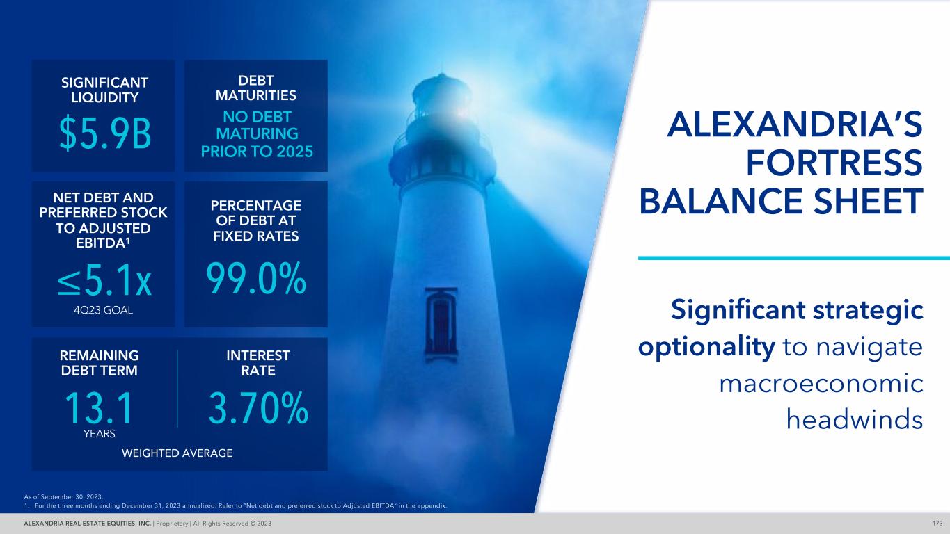 172ALEXANDRIA REAL ESTATE EQUITIES, INC. | Proprietary | All Rights Reserved © 2023 As of September 30, 2023. WEIGHTED-AVERAGE REMAINING DEBT TERM ALEXANDRIA’S LOW LEVEL OF DEBT MATURING IN THE NEXT 5 YEARS 13.1 YEARS OF TOTAL DEBT MATURES IN THE NEXT 5 YEARS19% ONLY