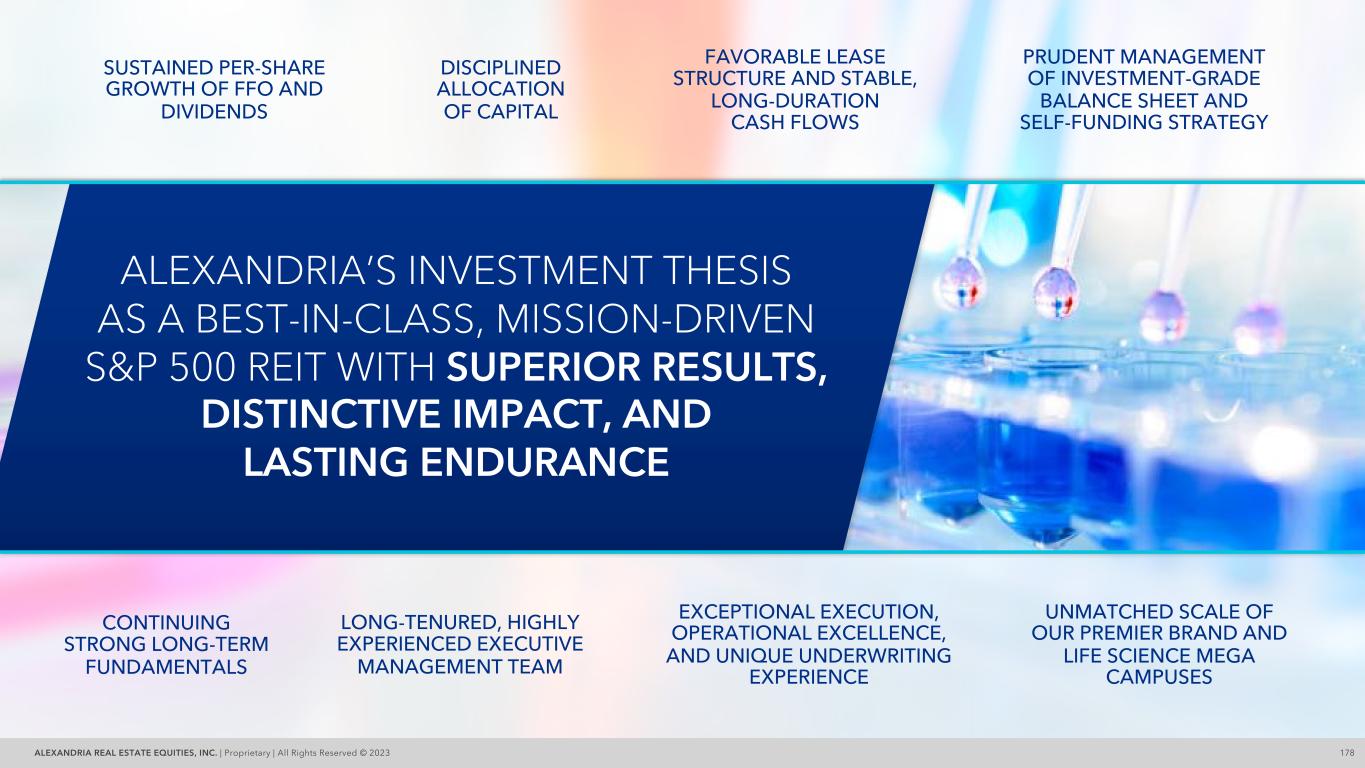 178ALEXANDRIA REAL ESTATE EQUITIES, INC. | Proprietary | All Rights Reserved © 2023 FAVORABLE LEASE STRUCTURE AND STABLE, LONG-DURATION CASH FLOWS PRUDENT MANAGEMENT OF INVESTMENT-GRADE BALANCE SHEET AND SELF-FUNDING STRATEGY CONTINUING STRONG LONG-TERM FUNDAMENTALS DISCIPLINED ALLOCATION OF CAPITAL UNMATCHED SCALE OF OUR PREMIER BRAND AND LIFE SCIENCE MEGA CAMPUSES LONG-TENURED, HIGHLY EXPERIENCED EXECUTIVE MANAGEMENT TEAM EXCEPTIONAL EXECUTION, OPERATIONAL EXCELLENCE, AND UNIQUE UNDERWRITING EXPERIENCE SUSTAINED PER-SHARE GROWTH OF FFO AND DIVIDENDS ALEXANDRIA’S INVESTMENT THESIS AS A BEST-IN-CLASS, MISSION-DRIVEN S&P 500 REIT WITH SUPERIOR RESULTS, DISTINCTIVE IMPACT, AND LASTING ENDURANCE