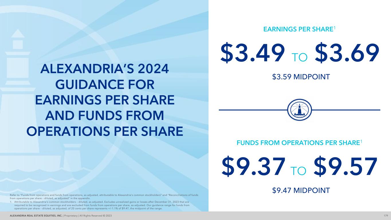 177ALEXANDRIA REAL ESTATE EQUITIES, INC. | Proprietary | All Rights Reserved © 2023 ALEXANDRIA INVESTOR DAY 2023 At the Vanguard of the Secularly Growing Life Science Industry and Powered by Capital Self-Sufficiency ALEXANDRIA’S 2024 GUIDANCE
