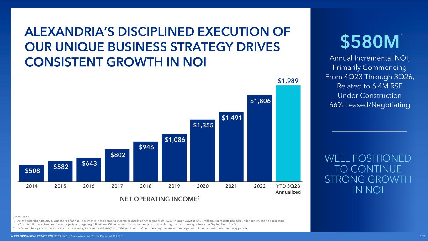 182ALEXANDRIA REAL ESTATE EQUITIES, INC. | Proprietary | All Rights Reserved © 2023 ALEXANDRIA’S DISCIPLINED EXECUTION OF OUR UNIQUE BUSINESS STRATEGY DRIVES CONSISTENT GROWTH IN NOI $ in millions. 1. As of September 30, 2023. Our share of annual incremental net operating income primarily commencing from 4Q23 through 3Q26 is $491 million. Represents projects under construction aggregating 5.6 million RSF and two near-term projects aggregating 0.8 million RSF expected to commence construction during the next three quarters after September 30, 2023. 2. Refer to “Net operating income and net operating income (cash basis)” and “Reconciliation of net operating income and net operating income (cash basis)” in the appendix. $508 $582 $643 $802 $946 $1,086 $1,355 $1,491 $1,806 $1,989 2014 2015 2016 2017 2018 2019 2020 2021 2022 YTD 3Q23 Annualized NET OPERATING INCOME2 WELL POSITIONED TO CONTINUE STRONG GROWTH IN NOI $580M Annual Incremental NOI, Primarily Commencing From 4Q23 Through 3Q26, Related to 6.4M RSF Under Construction 66% Leased/Negotiating 1