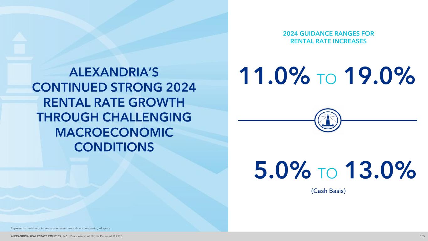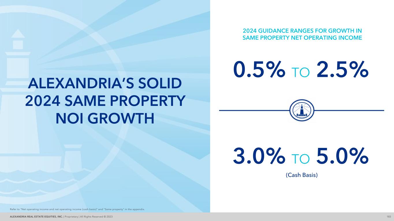 183ALEXANDRIA REAL ESTATE EQUITIES, INC. | Proprietary | All Rights Reserved © 2023 ALEXANDRIA’S SOLID 2024 SAME PROPERTY NOI GROWTH Refer to "Net operating income and net operating income (cash basis)" and "Same property" in the appendix. 2024 GUIDANCE RANGES FOR GROWTH IN SAME PROPERTY NET OPERATING INCOME 3.0% TO 5.0% (Cash Basis) 0.5% TO 2.5%