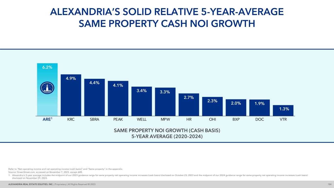184ALEXANDRIA REAL ESTATE EQUITIES, INC. | Proprietary | All Rights Reserved © 2023 ALEXANDRIA’S SOLID RELATIVE 5-YEAR-AVERAGE SAME PROPERTY CASH NOI GROWTH Refer to "Net operating income and net operating income (cash basis)" and "Same property" in the appendix. Source: GreenStreet.com, accessed on November 7, 2023, except ARE. 1. Alexandria’s 5-year average includes the midpoint of our 2023 guidance range for same property net operating income increases (cash basis) disclosed on October 23, 2023 and the midpoint of our 2024 guidance range for same property net operating income increases (cash basis) disclosed on November 29, 2023. 6.2% 4.9% 4.4% 4.1% 3.4% 3.3% 2.7% 2.3% 2.0% 1.9% 1.3% ARE KRC SBRA PEAK WELL MPW HR OHI BXP DOC VTRA 1 SAME PROPERTY NOI GROWTH (CASH BASIS) 5-YEAR AVERAGE (2020–2024)