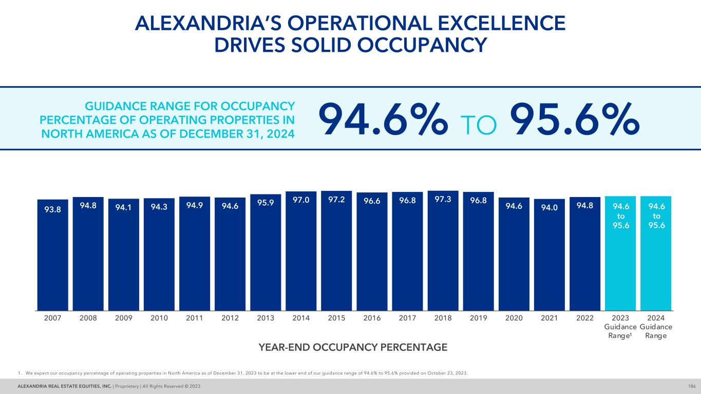 185ALEXANDRIA REAL ESTATE EQUITIES, INC. | Proprietary | All Rights Reserved © 2023 ALEXANDRIA’S CONTINUED STRONG 2024 RENTAL RATE GROWTH THROUGH CHALLENGING MACROECONOMIC CONDITIONS Represents rental rate increases on lease renewals and re-leasing of space. 2024 GUIDANCE RANGES FOR RENTAL RATE INCREASES 5.0% TO 13.0% (Cash Basis) 11.0% TO 19.0%